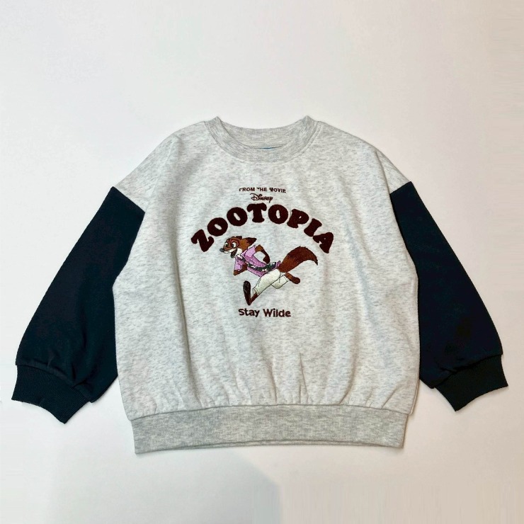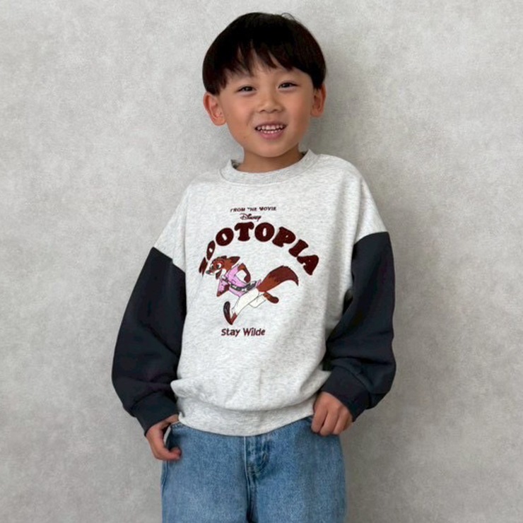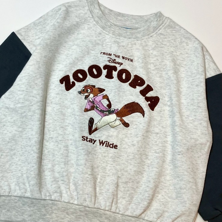 ディズニーとコラボレーションした袖配色裏毛トレーナーは、ズートピアのニックのベロア刺繍入り。