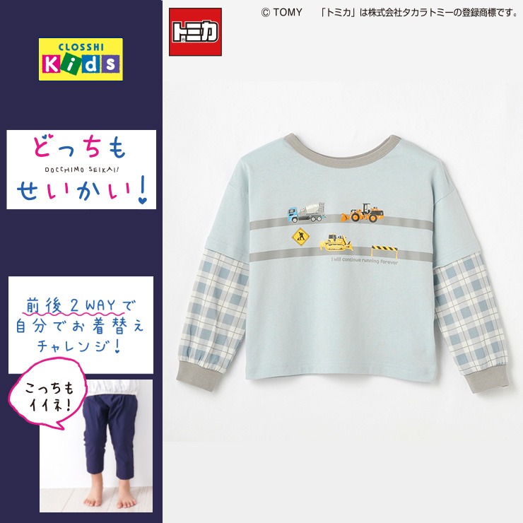 CLOSSHI Kids×トミカ「どっちもまえ」の長袖Tシャツです。