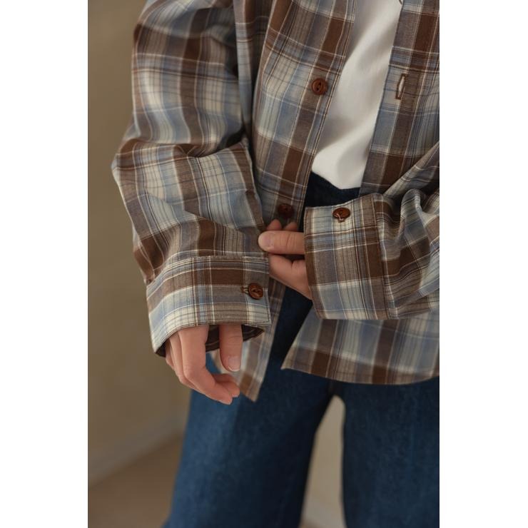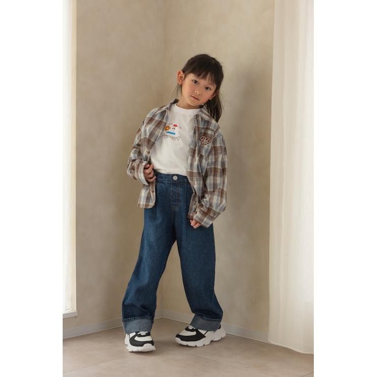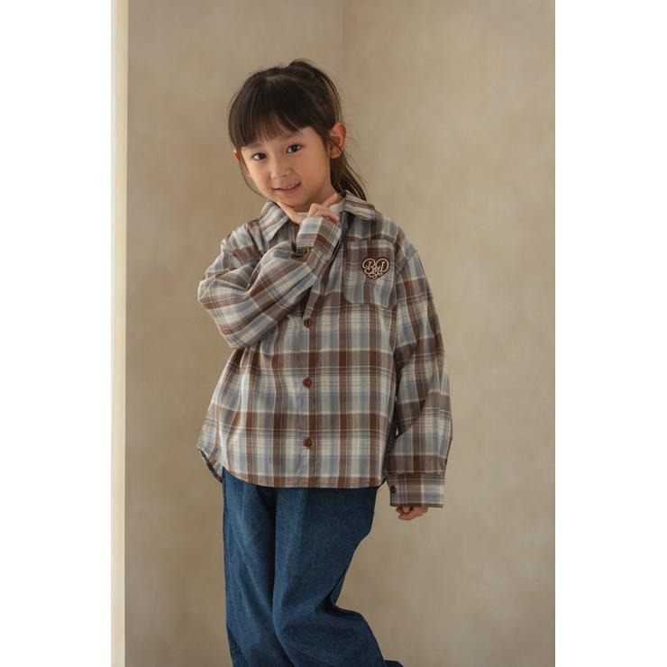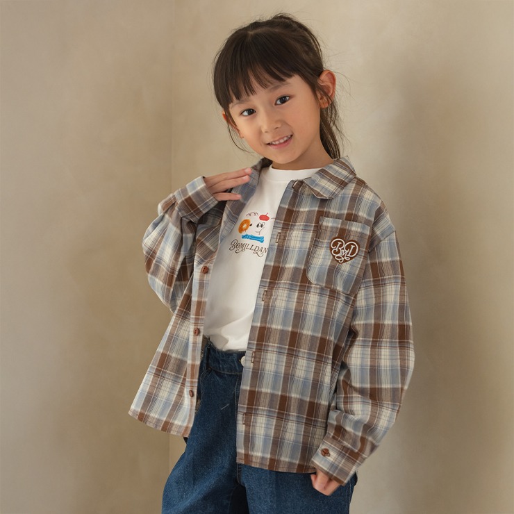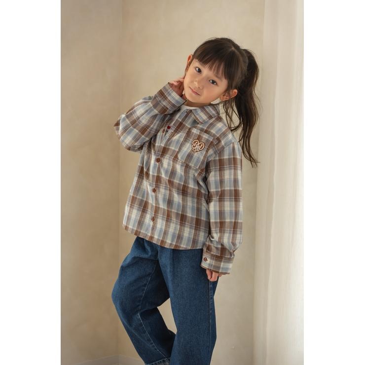 チェックシャツの胸ポケットに可愛いモチーフが特徴です。