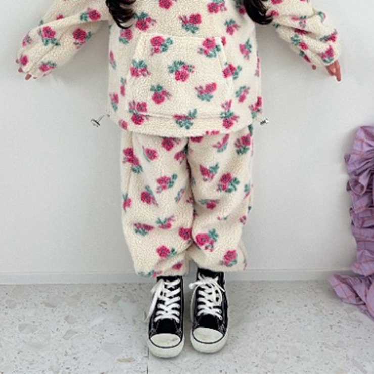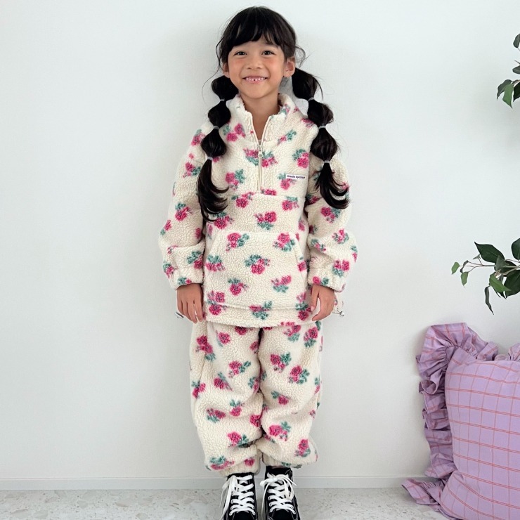 カラフルなコーデが可愛いayanoさんとのコラボアイテム大人サイズ第5弾の"子供サイズ"が誕生!花柄のボアパンツ。ふわふわもこもこの素材で、寒い季節もあたたかく過ごせます。同じ柄のハーフジップと合わせれば、ポップで楽しいコーデが完成♪