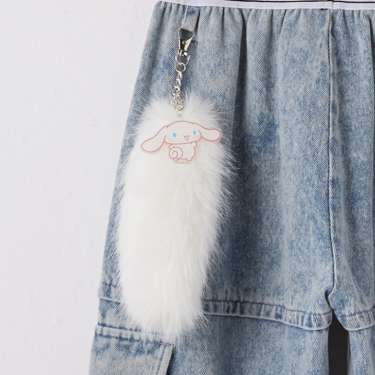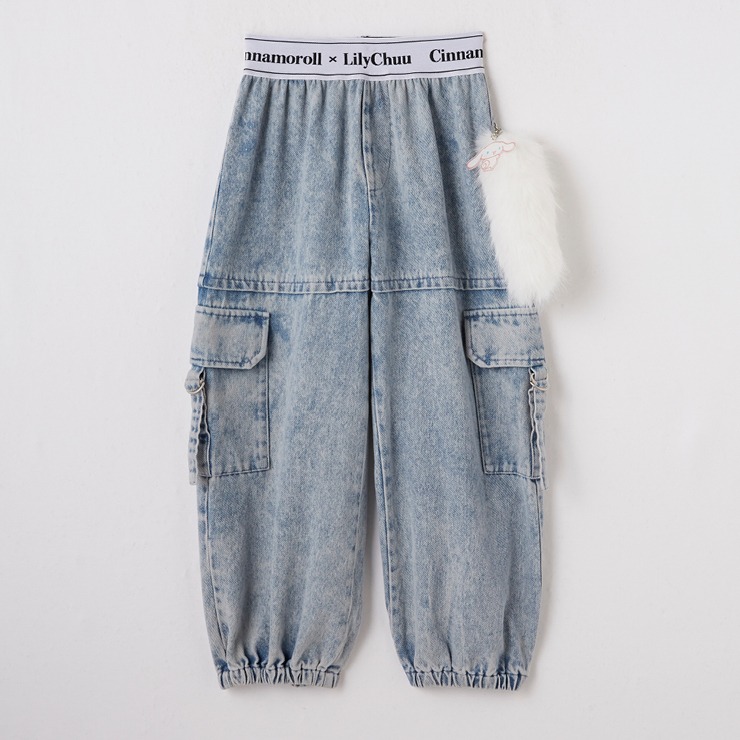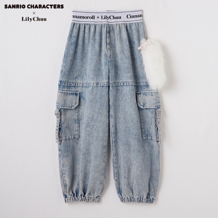 シナモロール×Lily Chuuのデニムカーゴパンツです。シナモロールのチャーム付きしっぽがかわいい!