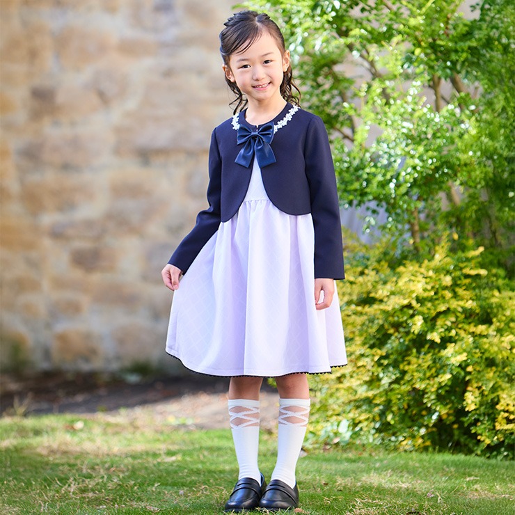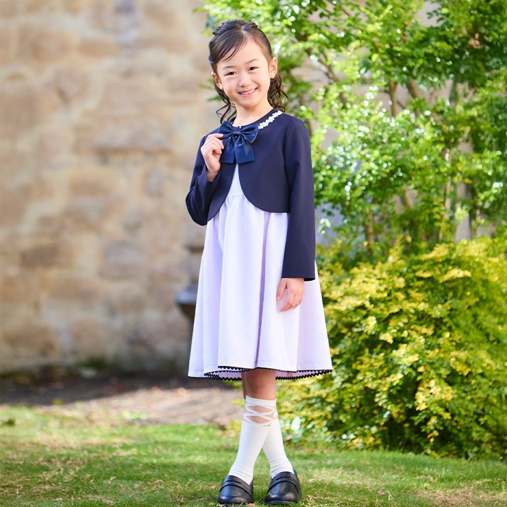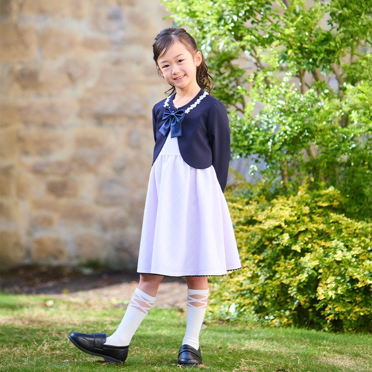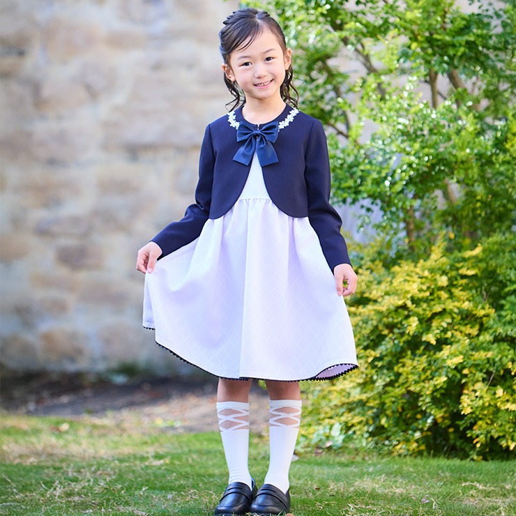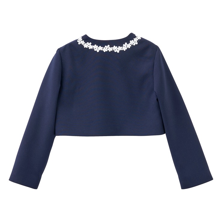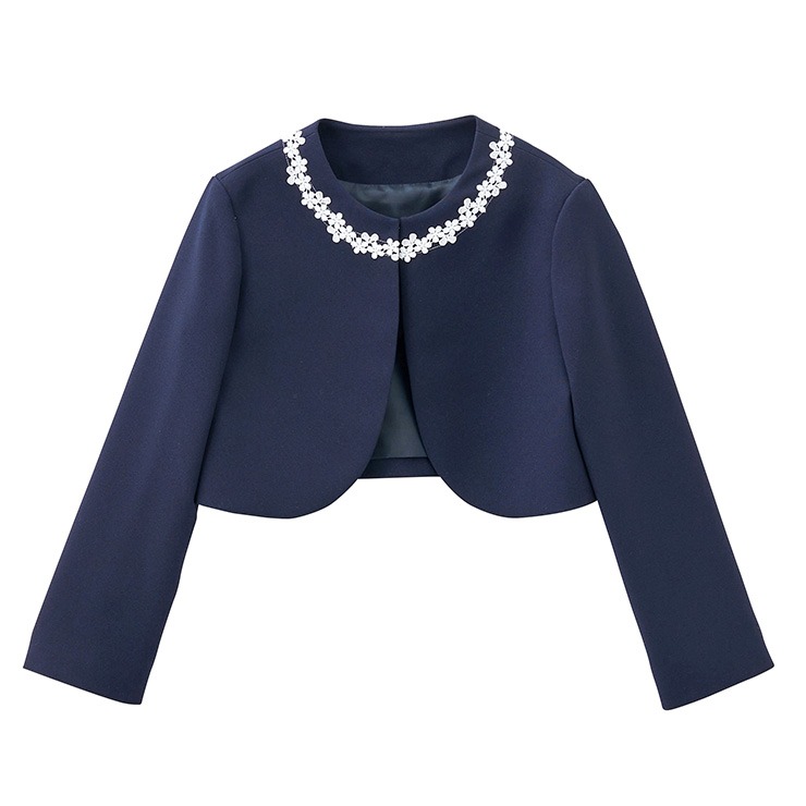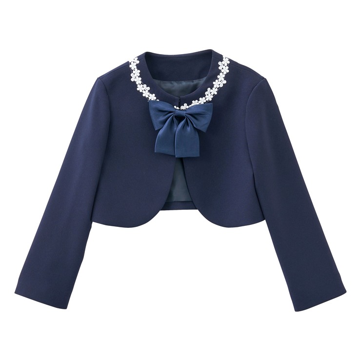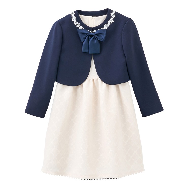 ジャガード織のジャンパースカートに濃紺ボレロを合わせたアンサンブルです。