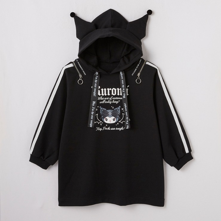 「クロミ」の耳付きフードがかわいいパーカーワンピースです。肩のジップをあけてもかわいいです。