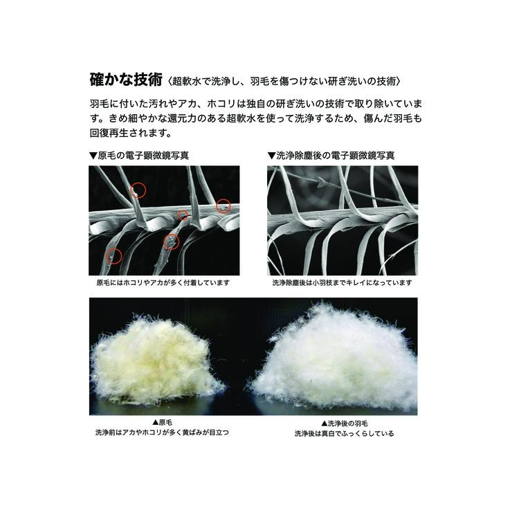 さらに、国内基準より厳しい清浄度検査をはじめ、さまざまな検査で実証された「キレイな羽毛」を提供しています。