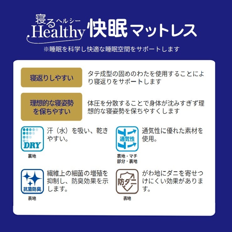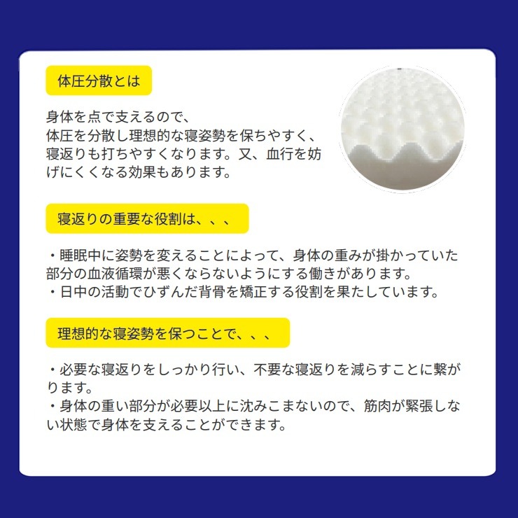 体圧を分散することで身体が沈みすぎず且つへたりにくく固さを保つことで理想的な寝姿勢を保ちやすくします。