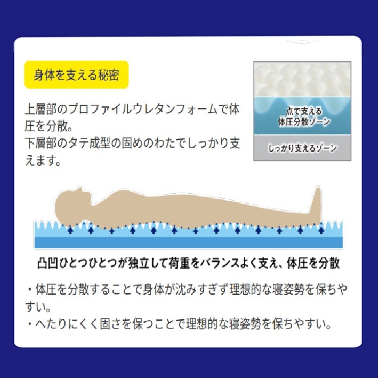上層部のプロファイルウレタンでで体圧分散、下層部の固めのわたでしっかり支えます。