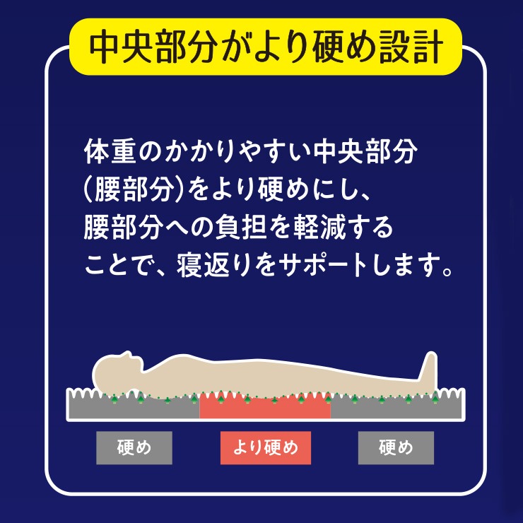 体重のかかりやすい中央部分(腰部分)をより硬めにし、腰部分への負担を軽減することで、寝返りをサポート。