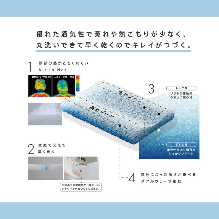 「Netヘルシーピロー」は優れた通気性で頭部に熱がこもりにくいAir in net構造の枕です。