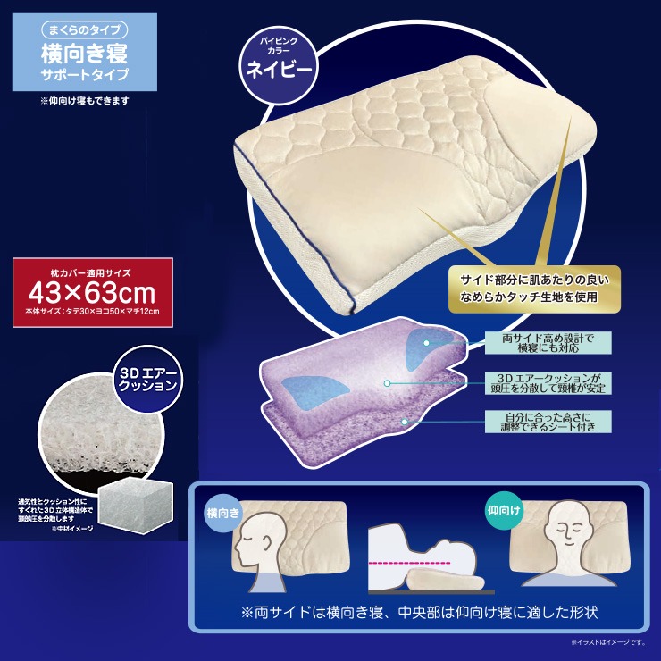横向き寝時の肩への負担を軽減するため両サイドを高めに設計、枕全体の高さが調整出来る高さ調整シートも装備しており、自分に合った高さにカスタマイズすることが可能!
