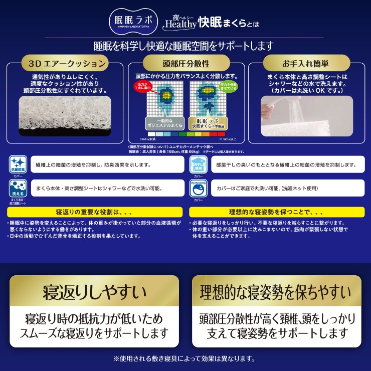 クッション性に優れた3D立体構造体により頭部圧を適度に分散することで理想的な寝姿勢を保ちやすくし、睡眠時の通気性にも優れておりあなたの睡眠を快適にサポートします!