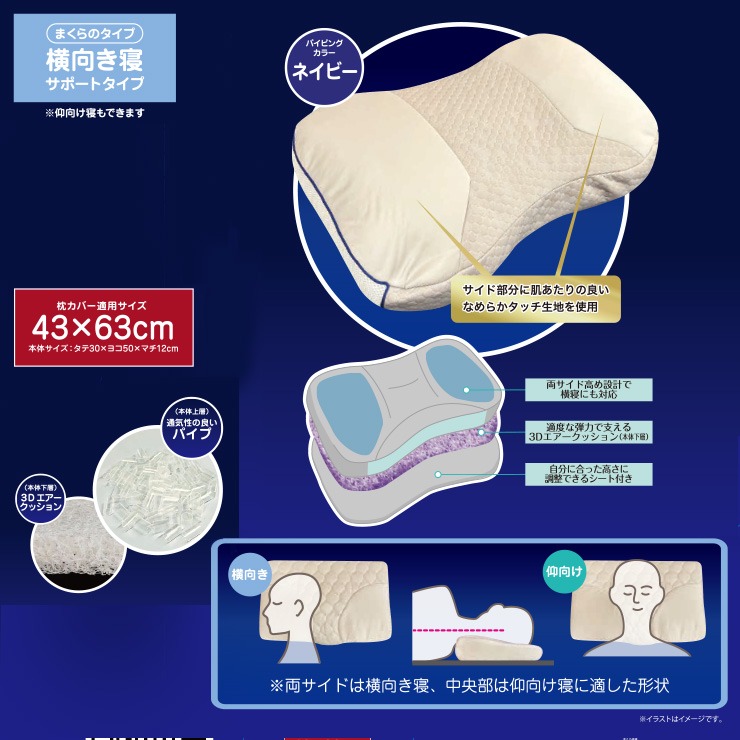 枕本体上層部は適度なかたさのパイプ、下層部に弾力性のある3D立体構造体シートを組み合わせることで睡眠時の頭部圧を適度に分散、過度な沈みこみも軽減するため理想的な寝姿勢をサポートします!