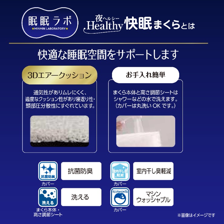 枕本体上層部は寝心地が良い低反発ウレタンフォーム、下層部に弾力性のある3D立体構造体シートを組み合わせることで睡眠時の頭部圧を適度に分散、過度な沈みこみも軽減するため理想的な寝姿勢をサポートします!
