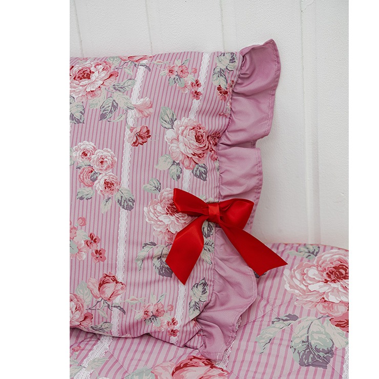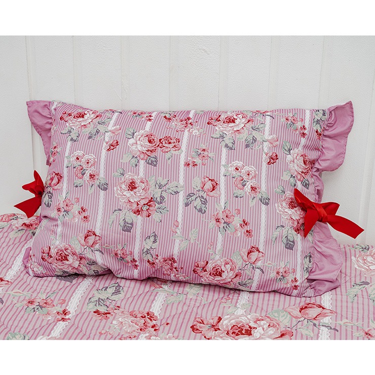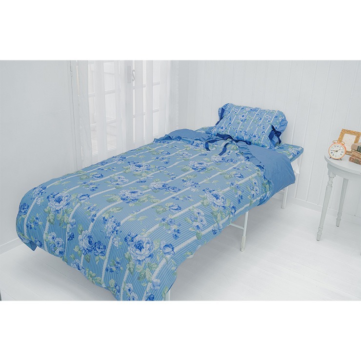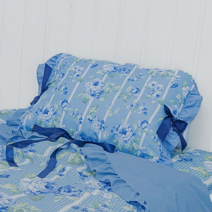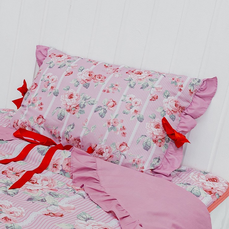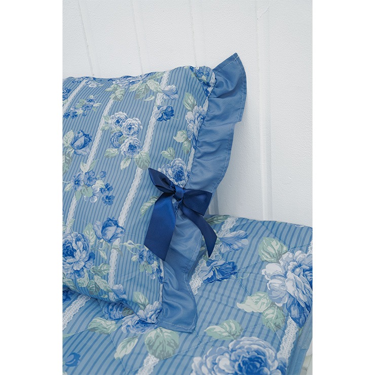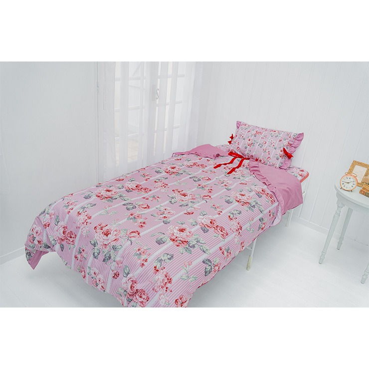 上品なフリルやリボンをあしらったデザインで、掛けふとんカバー、ポーチ付ブランケット(ひざ掛けサイズ)、敷きパッドとコーディネイトをお楽しみ頂けます。