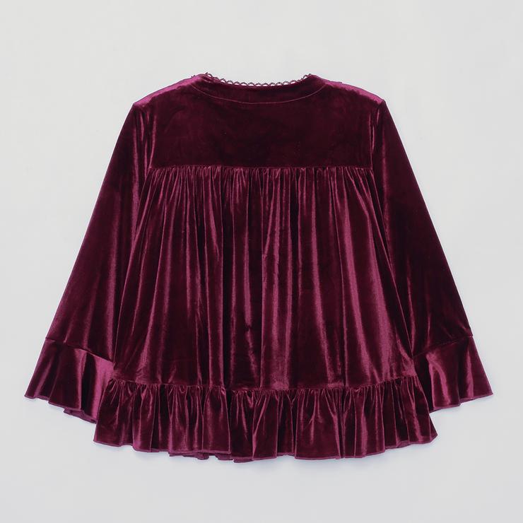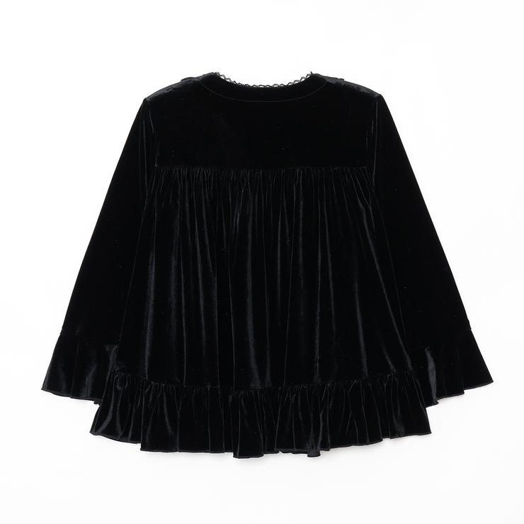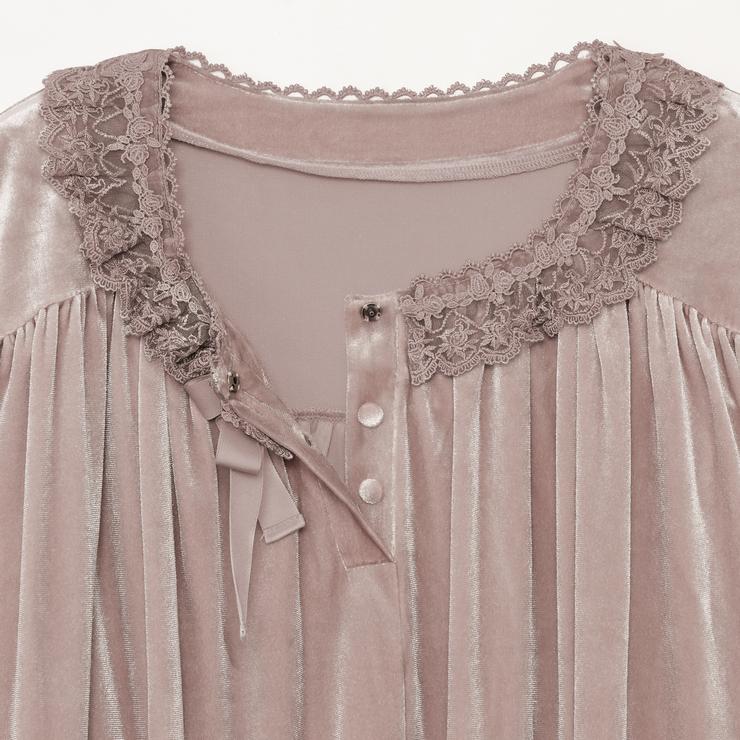 ベロア生地はストレッチ性があり、身幅やギャザー分量多めのゆったりした着心地です。