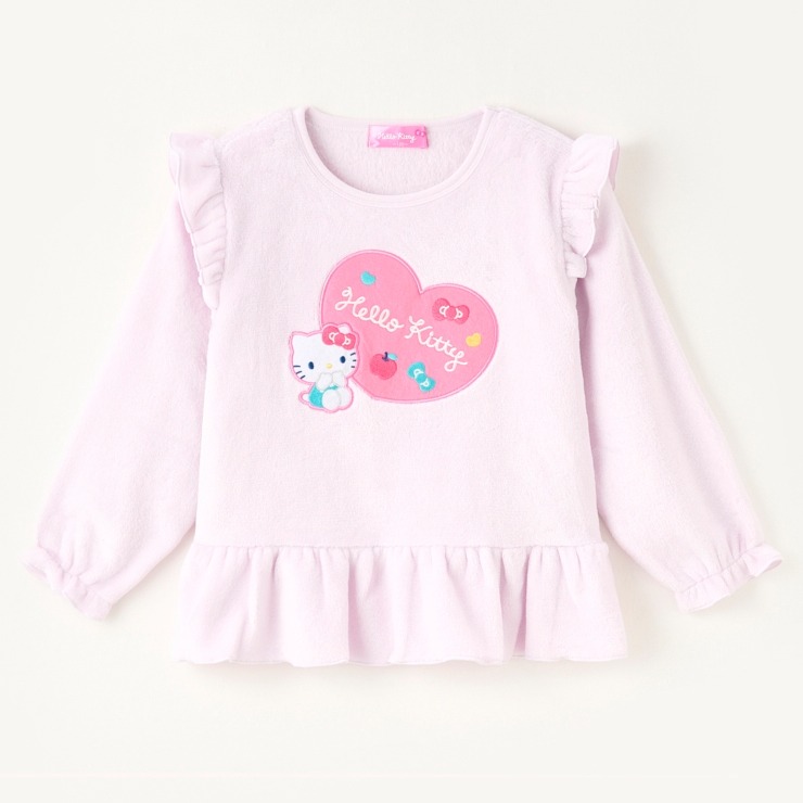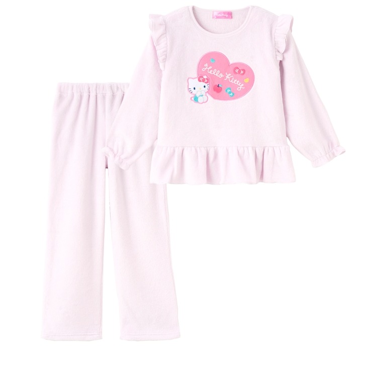 大人気のサンリオキャラクターズから ハローキティパジャマが登場。 ハローキティのアップリケ刺繍に肩・袖口・裾にフリルがついた長袖上着と、ロングパンツの組合せパジャマです。