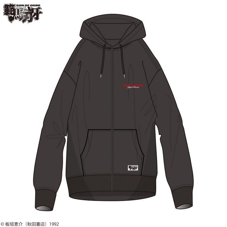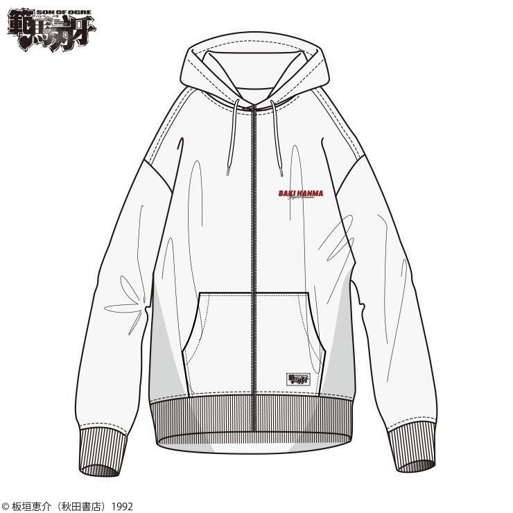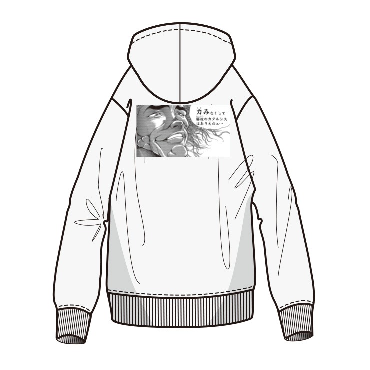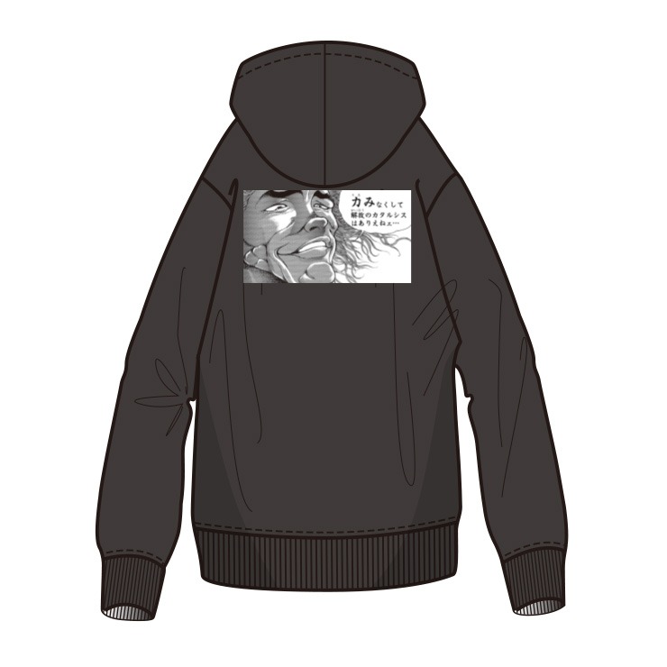 綿タッチのスポーティ素材を使ったほどよく大きいサイズのパーカをベースに範馬勇次郎の「力みなくして解放のカタルシスはありえねぇ…」のシーンを背中に大きくプリントしました。