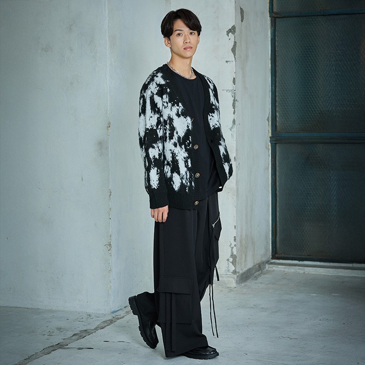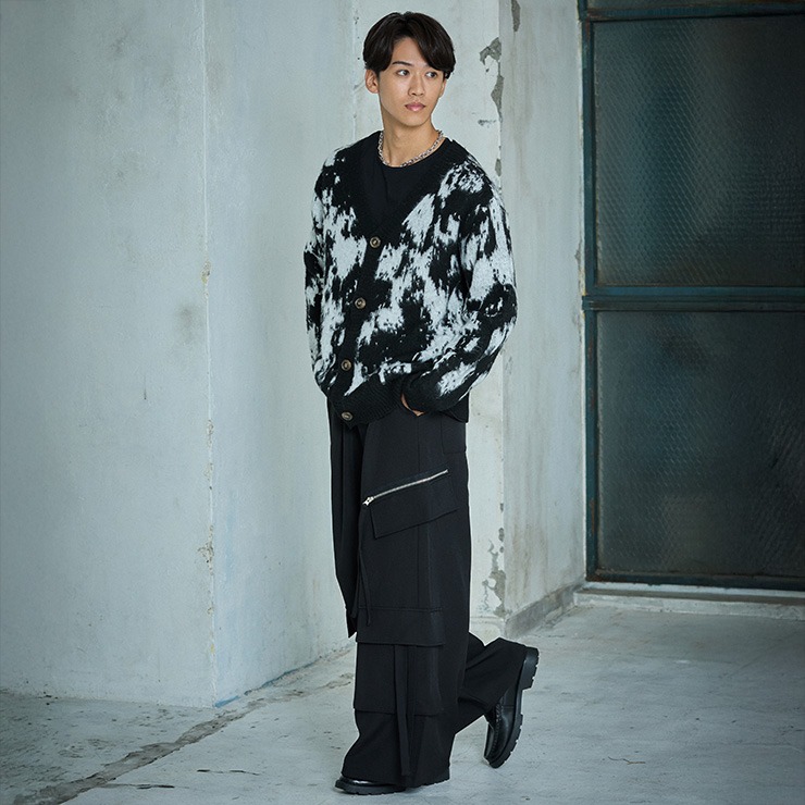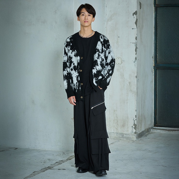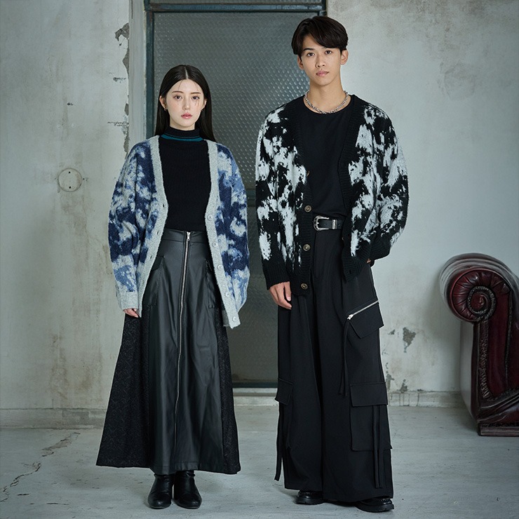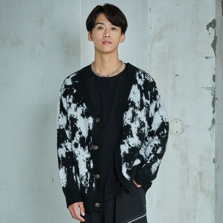 モードな雰囲気が漂うニュアンス柄ニットカーディガン。
