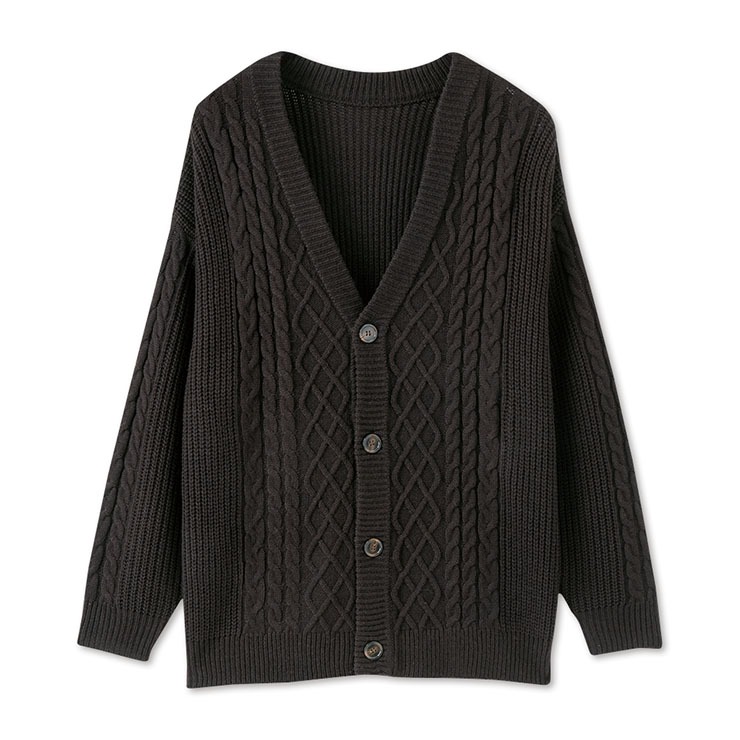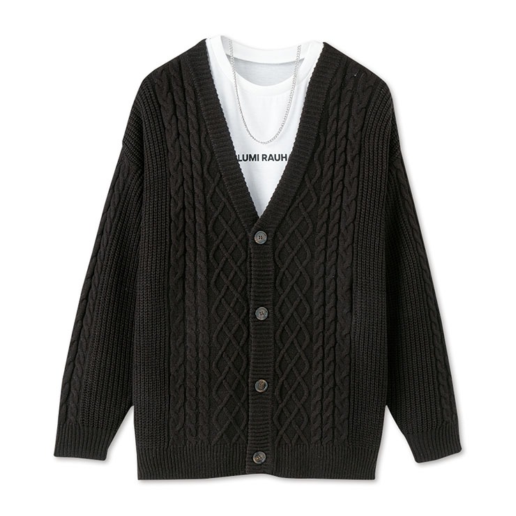 表情豊かなケーブル編みがポイントのVネックカーディガンと長袖Tシャツとネックレスの三点セット。