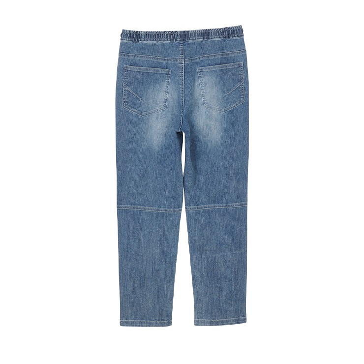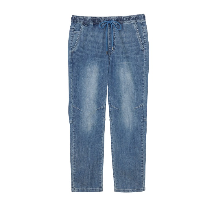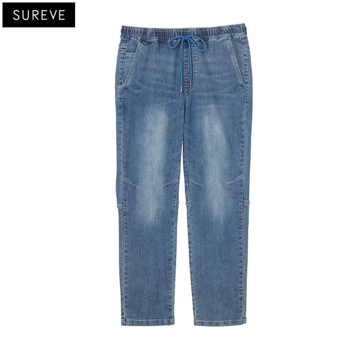 膝のタックや膝裏の切り替えが印象的な程良いストレッチのスリムストレートの総ゴムデニムパンツです。