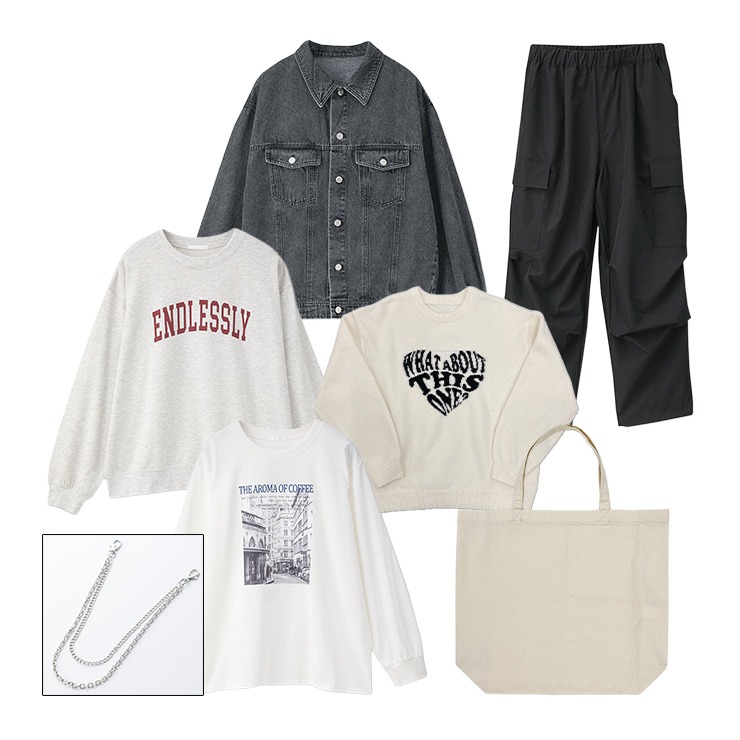 デニムジャケット・プルオーバー・ニットプルオーバー・Tシャツ・カーゴパンツ・ウォレットチェーン・トートバッグのお得な7点セットです!