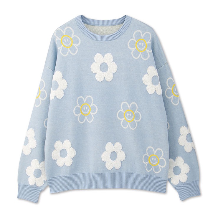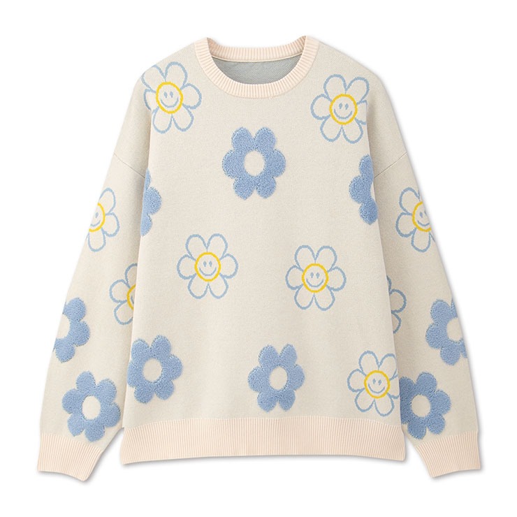 視線を惹きつける、ハッピー感全開の総柄ダブルジャカードセーター。
