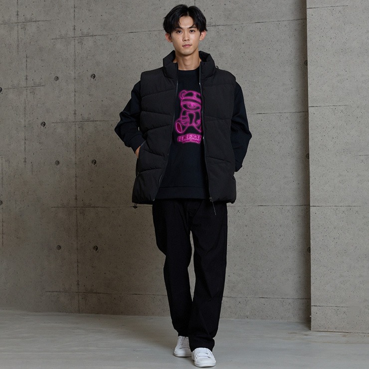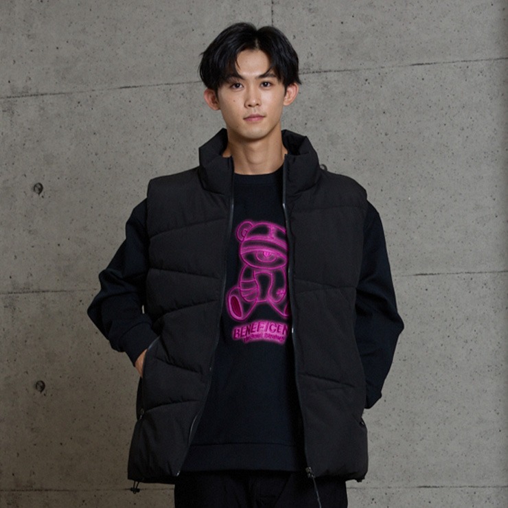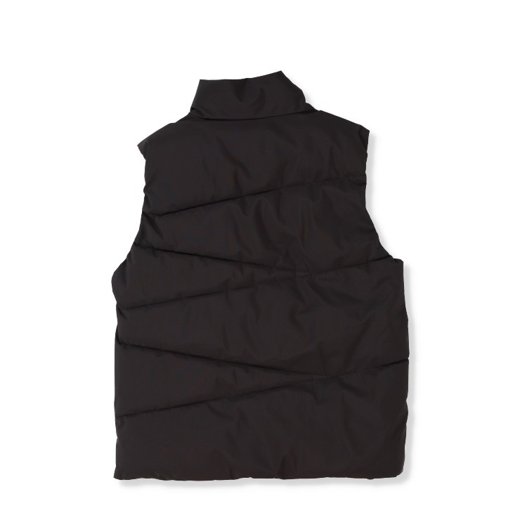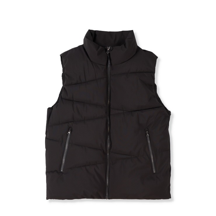スタンドネックで首回りがすっきりとしたデザインの中綿ベストです。