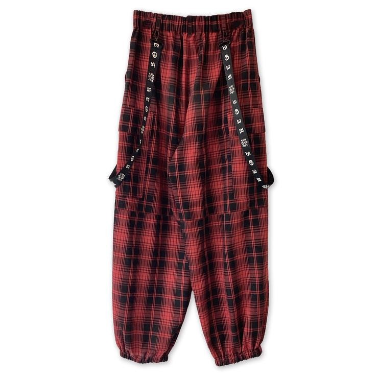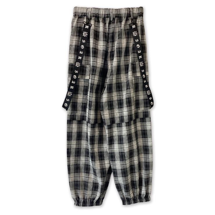 コーデの主役になるサスペンダー付きチェック柄カーゴパンツ。