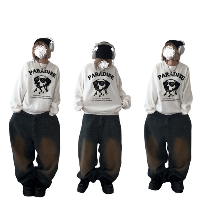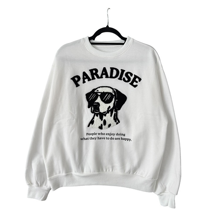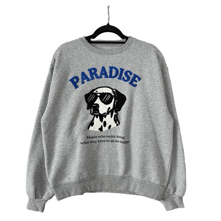 ダルメシアンの顔をサガラ刺しゅうで表現しているトレーナーです♪