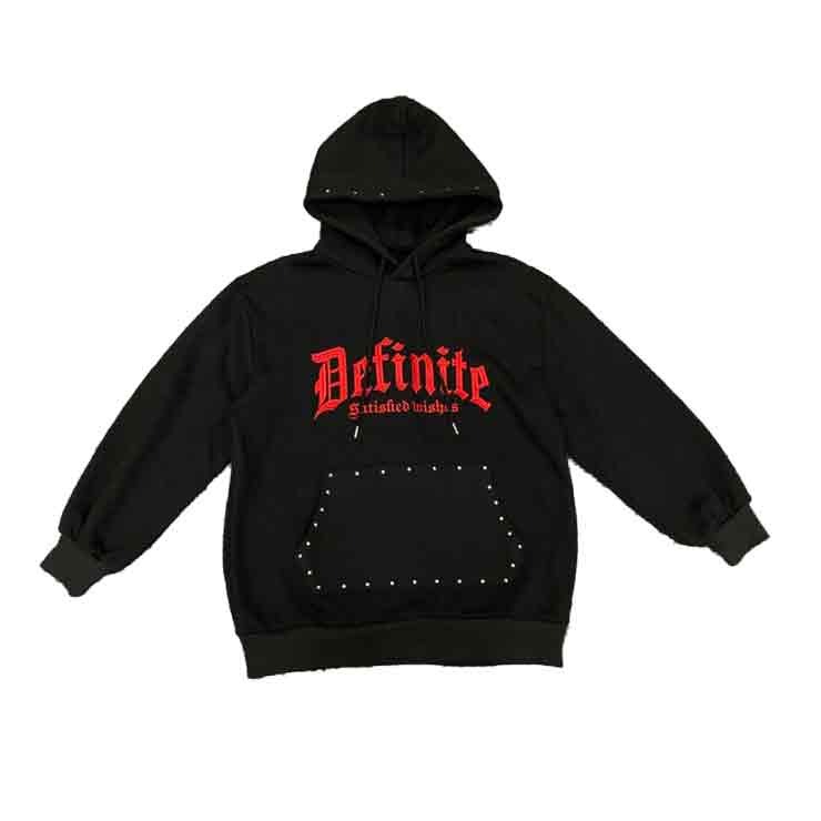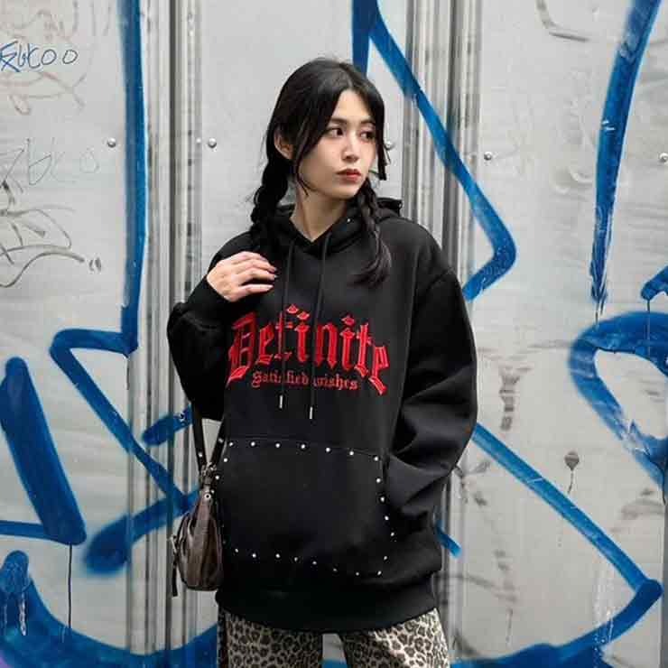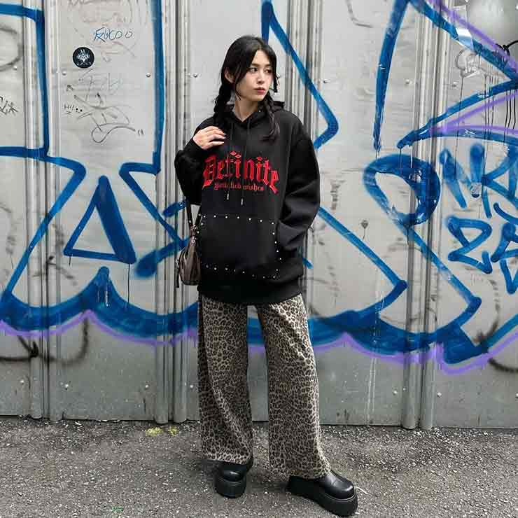 存在感のある胸のロゴとポケット部分のスタッズがポイントのカジュアルパーカ。
