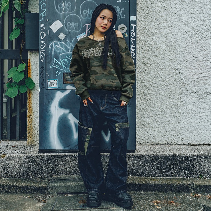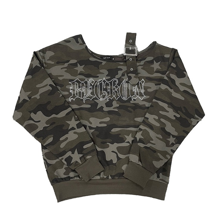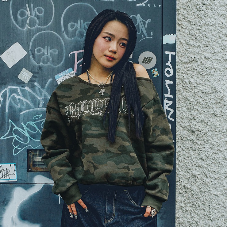 迷彩柄×ラインストーンロゴで存在感抜群のワンショルトップス。