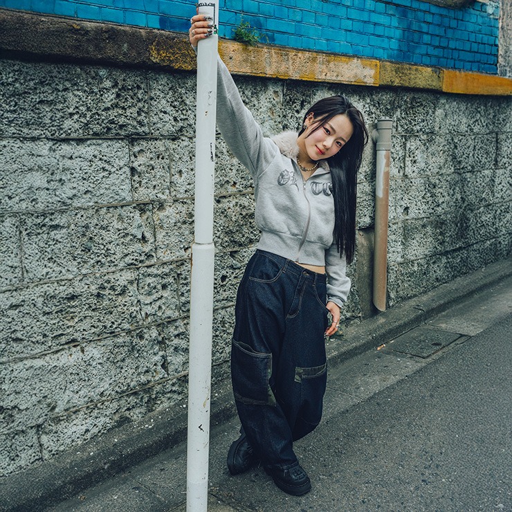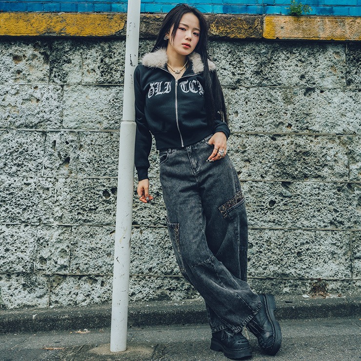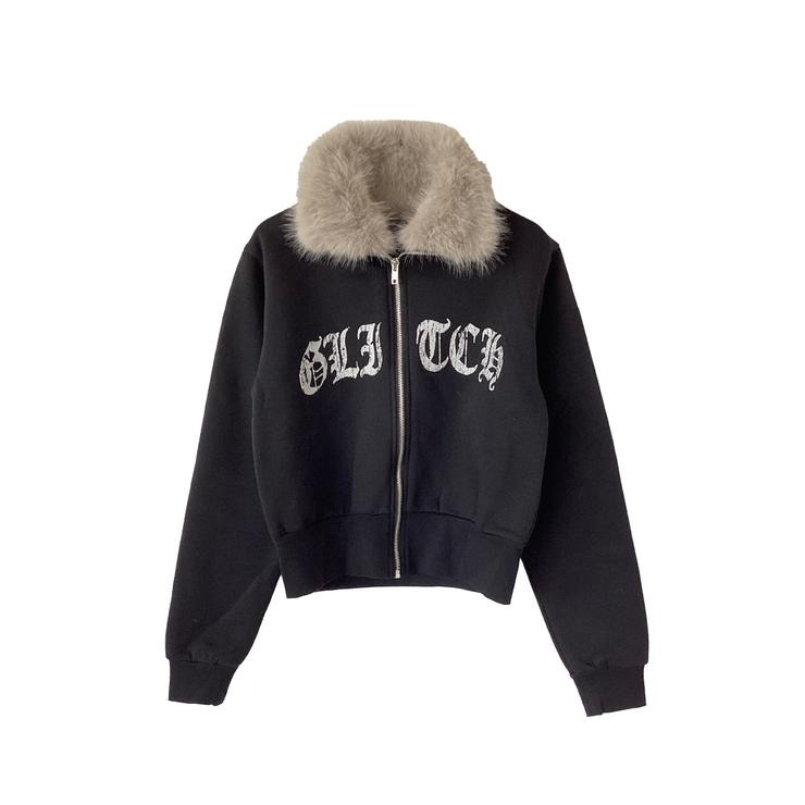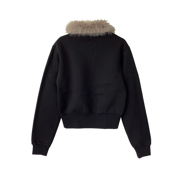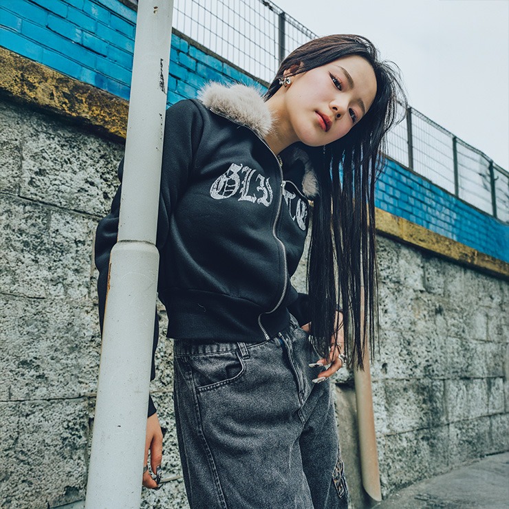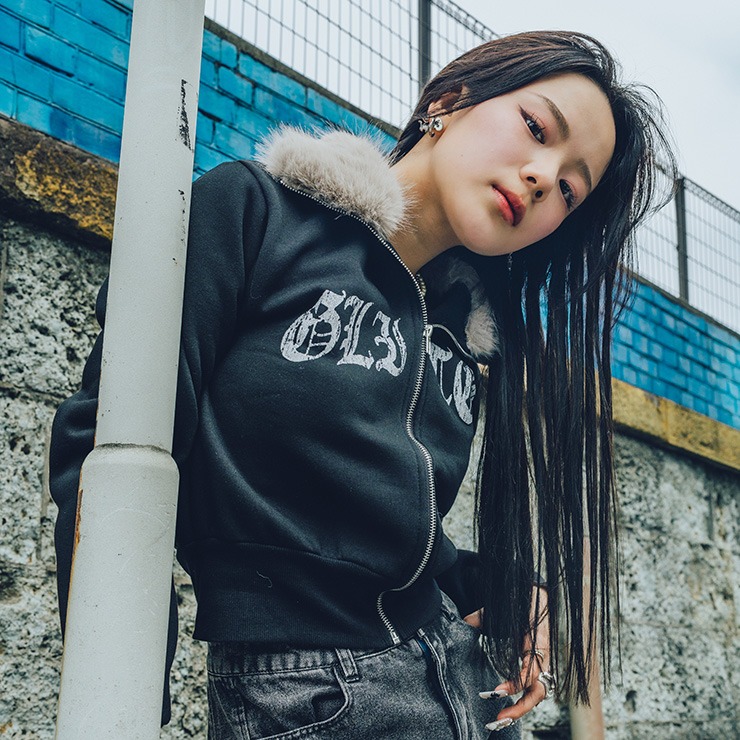 トレンドのY2Kムードをまとえる、襟ファー付きのミニ丈ZIPトップス。