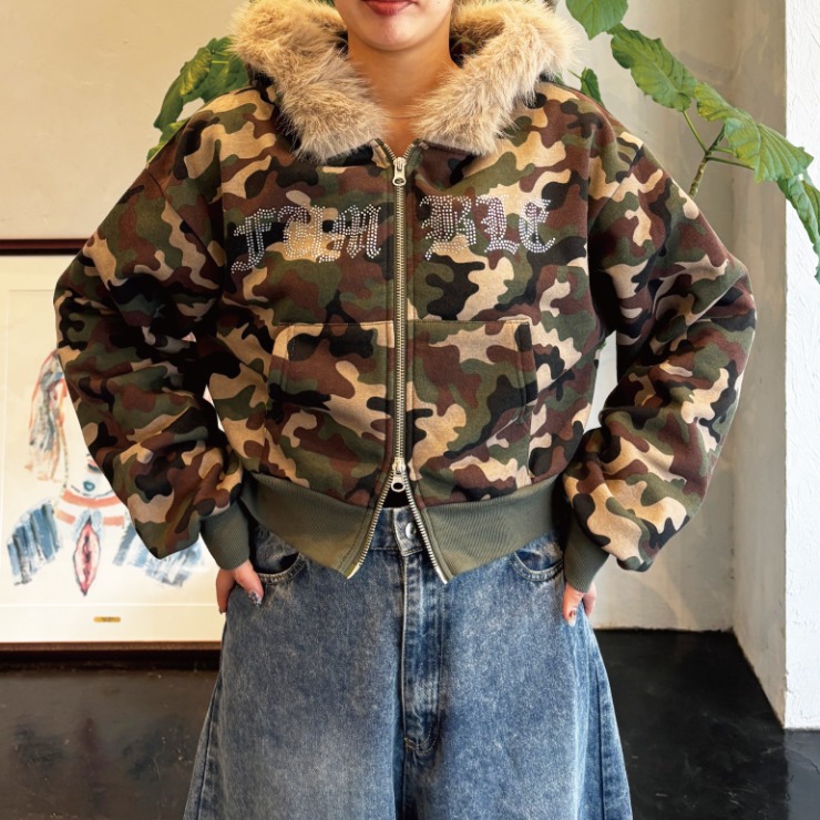フロントのラインストーンと、フードにはファーがついておりトレンド感抜群!