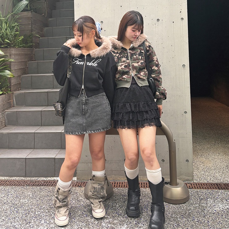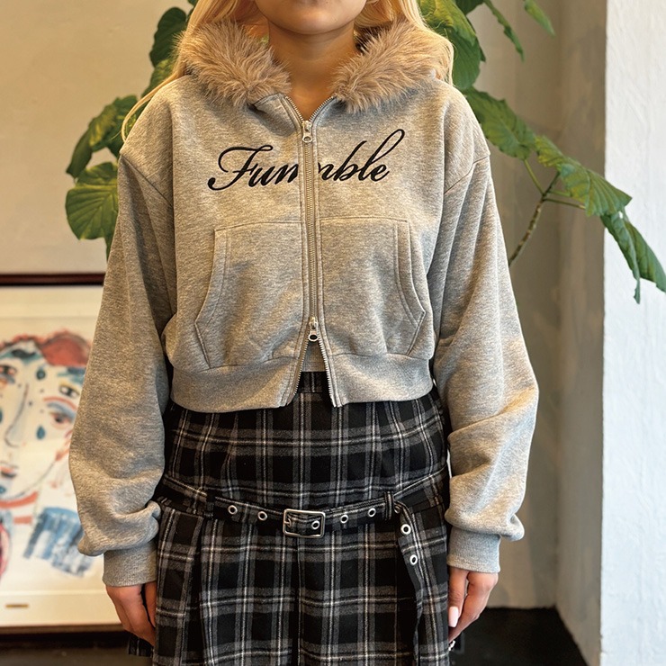 フロントの刺しゅうロゴと、フードにはファーがついておりトレンド感抜群!