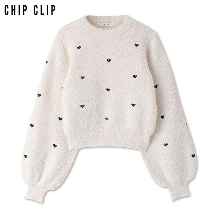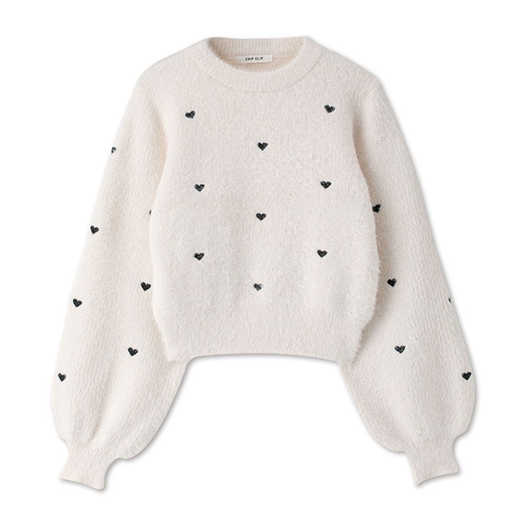 フェザーニットに小さなハート刺しゅうが散りばめられた、大人可愛いプルオーバー。