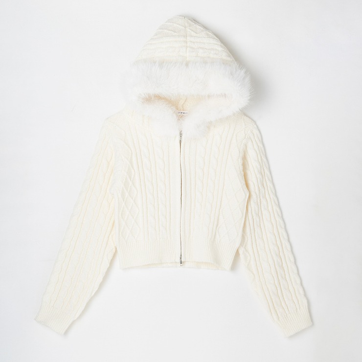 ケーブル編みとファーフードが、ガーリーな可愛さをぐっと引き立てます。