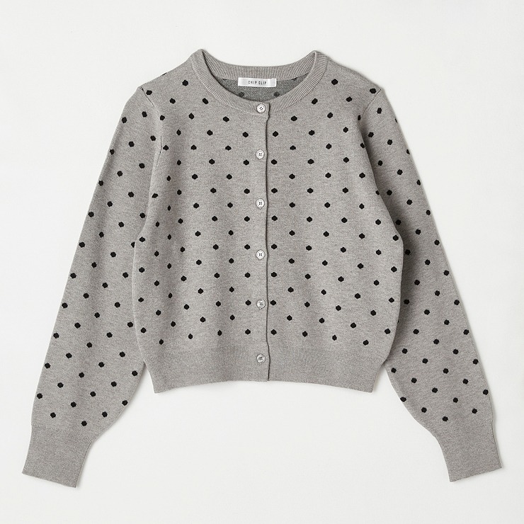 細かなドット柄が目を引く、ガーリーカジュアルなニットカーディガン。