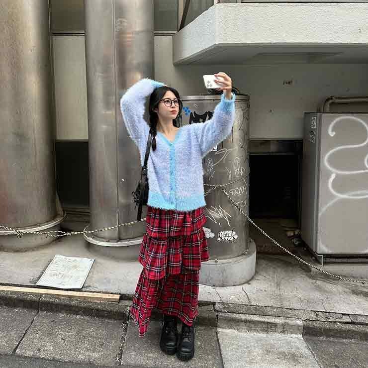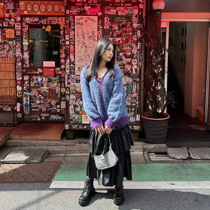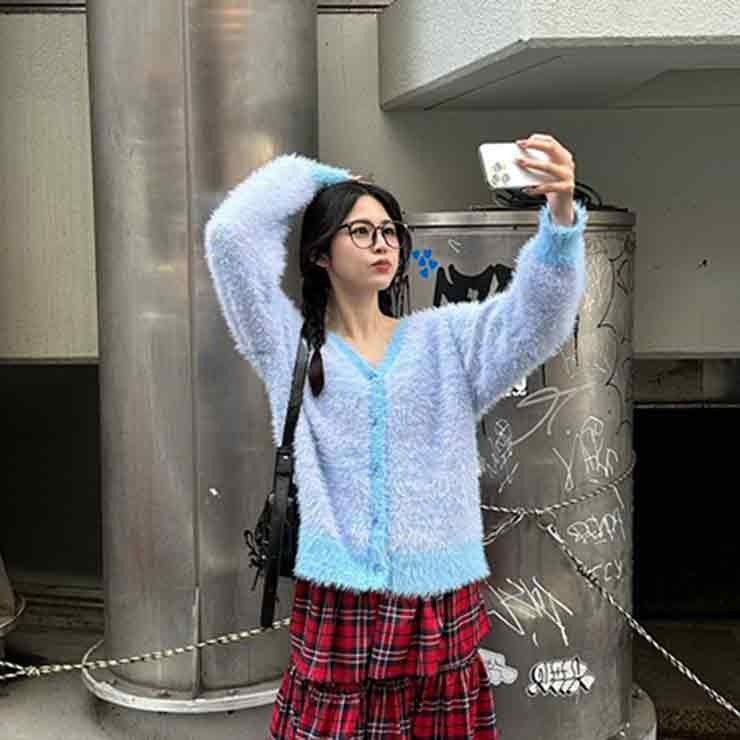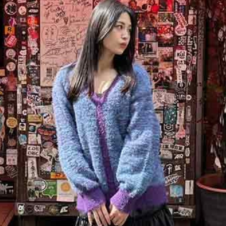 毛足の長いシャギー素材にミックスカラーを効かせた存在感抜群のカーディガン。