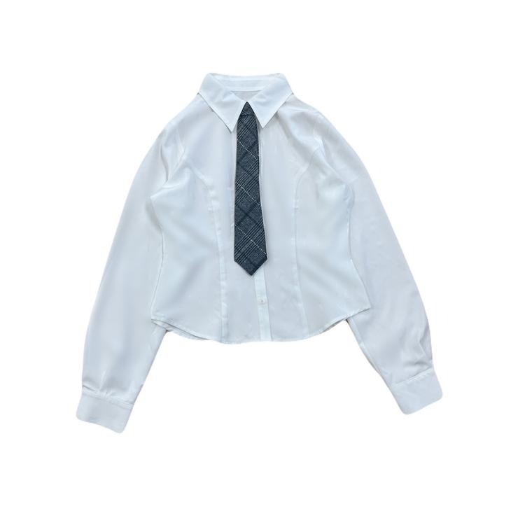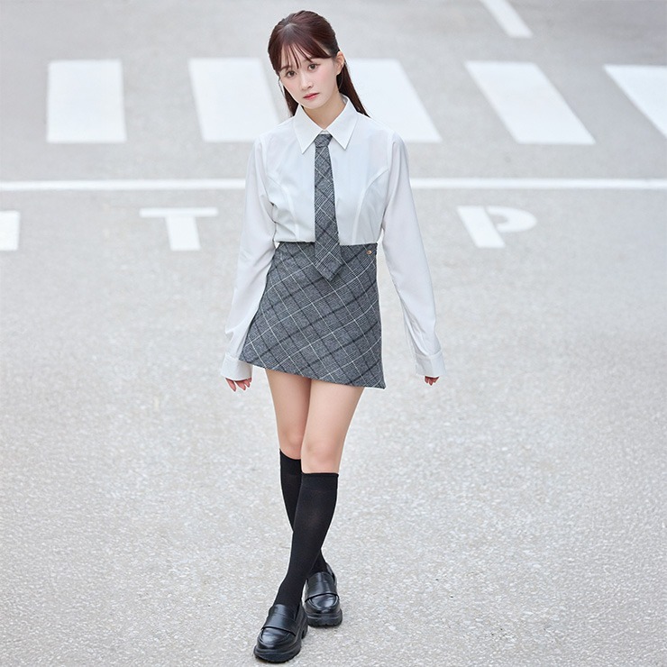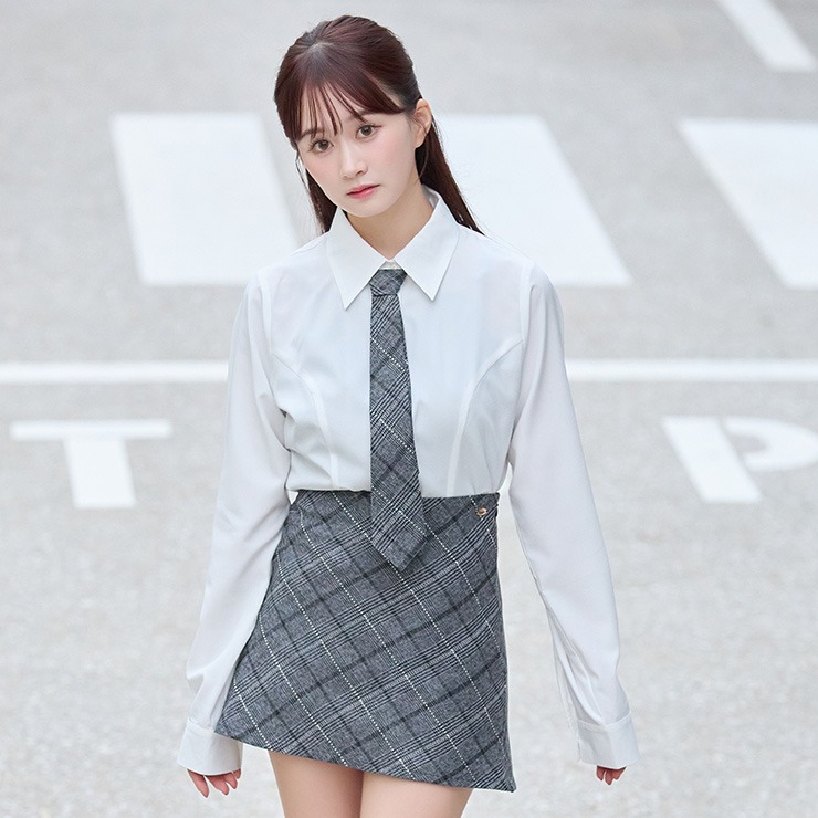 スカートと同じチェック柄ネクタイが付いた可愛いシャツ。