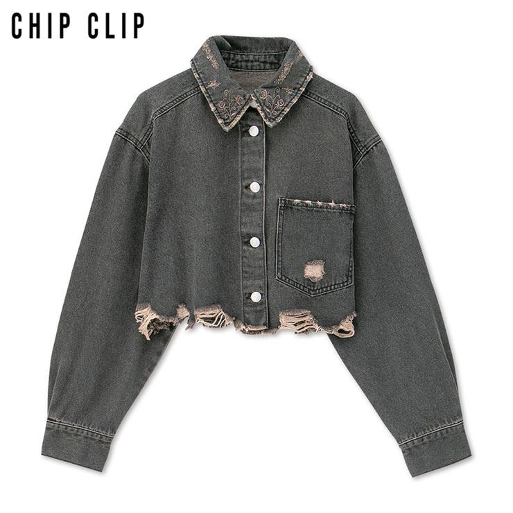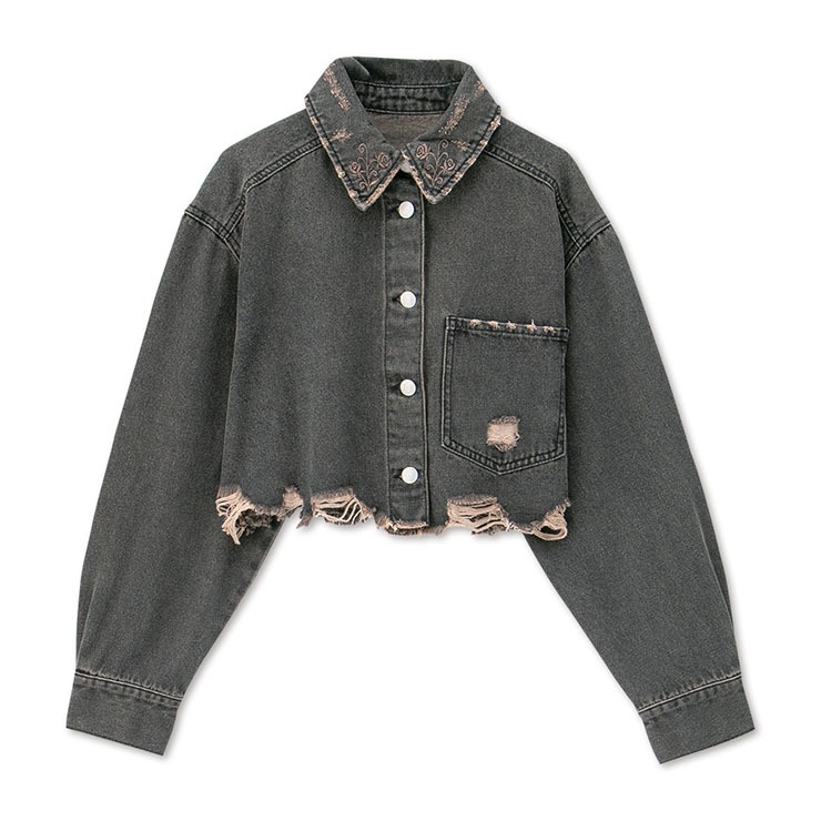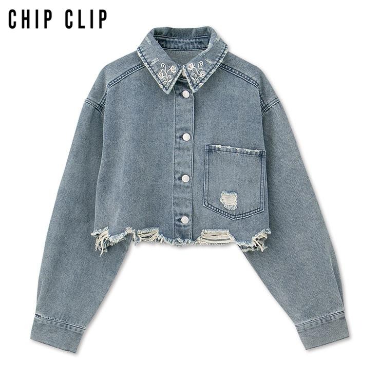 短丈のシルエットでハイウエストのボトムと相性が良く、襟の花刺しゅうがポイントのデニムブルゾンです。