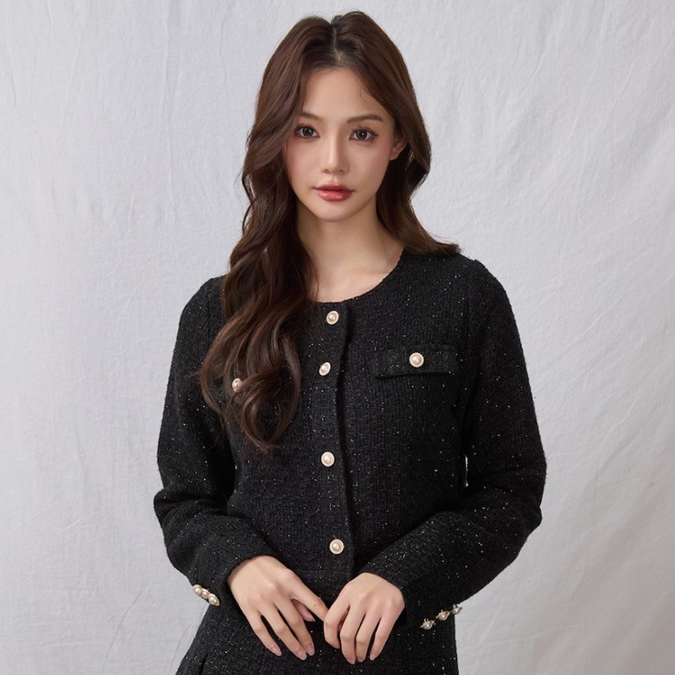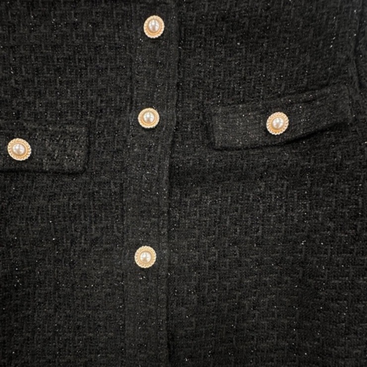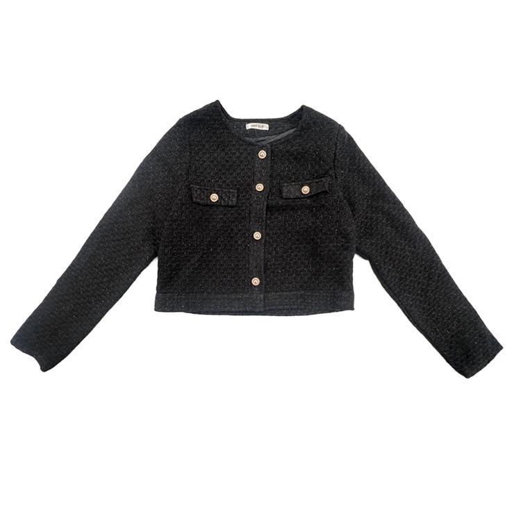 ゴールドのボタンがアクセントになっている、ショート丈が特徴のジャケット。