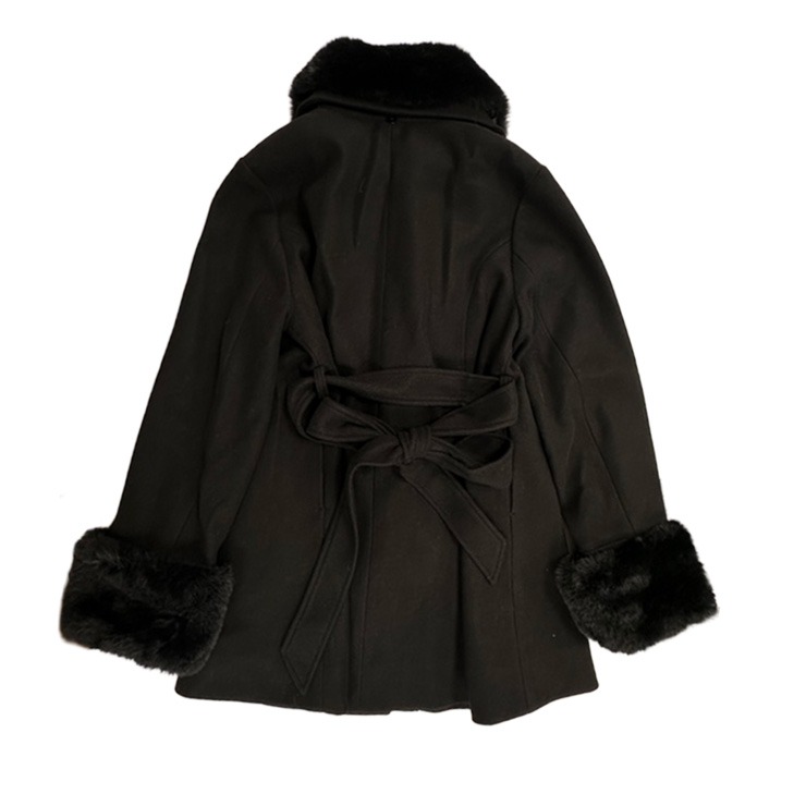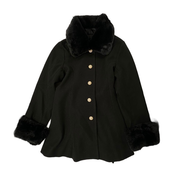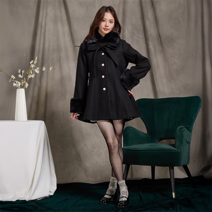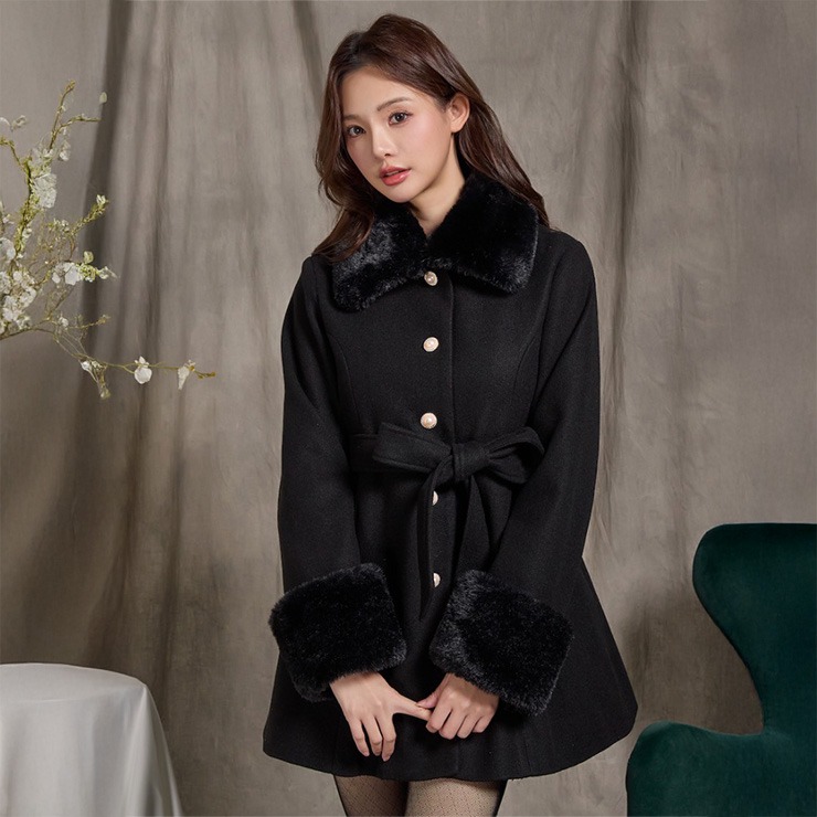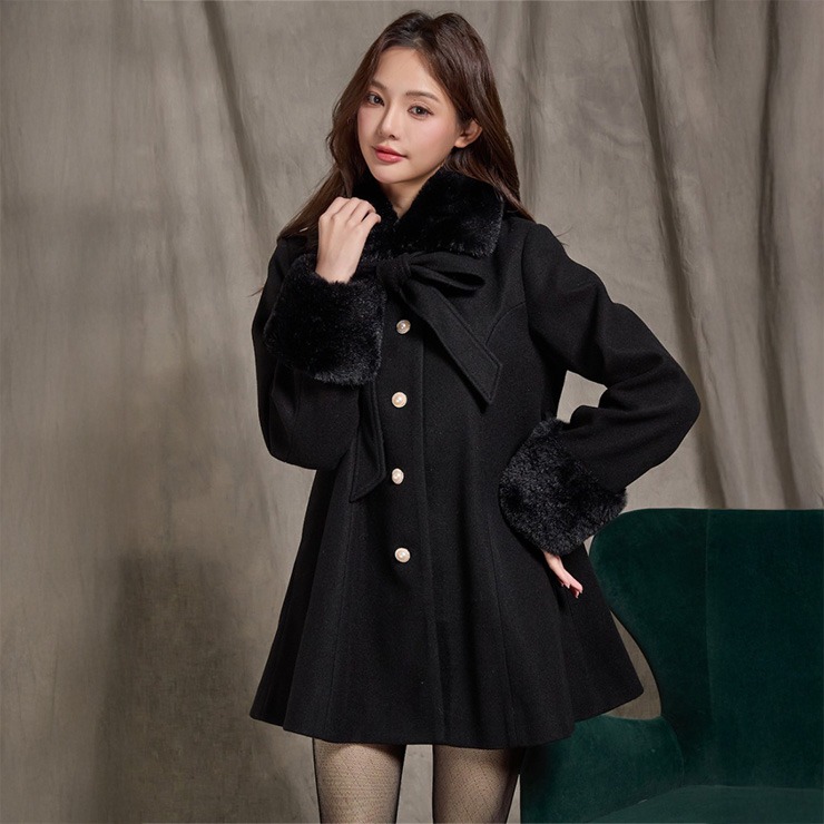 大きなリボンと襟と袖口にあしらったふわふわのファーが目を惹く、女性らしいシルエットを演出してくれるミドル丈コート。