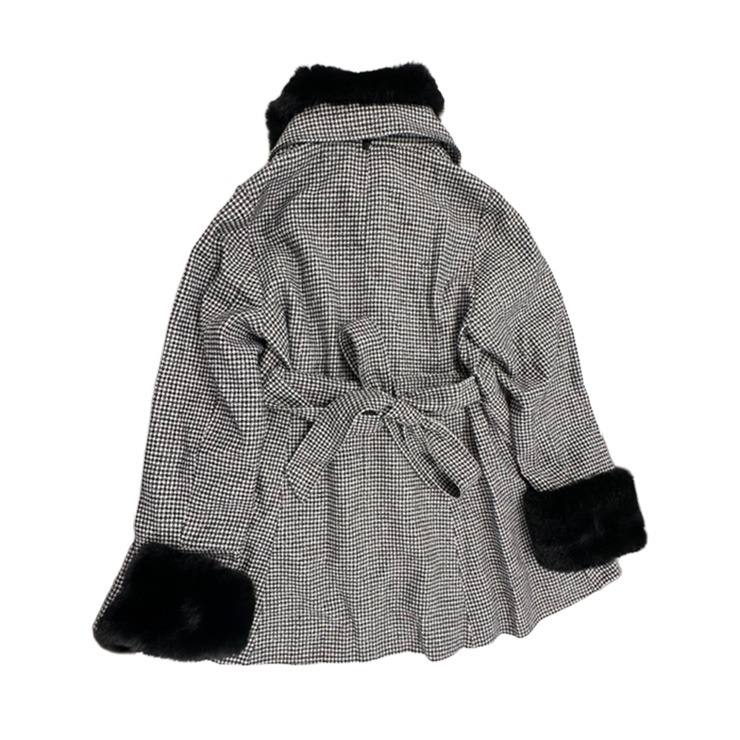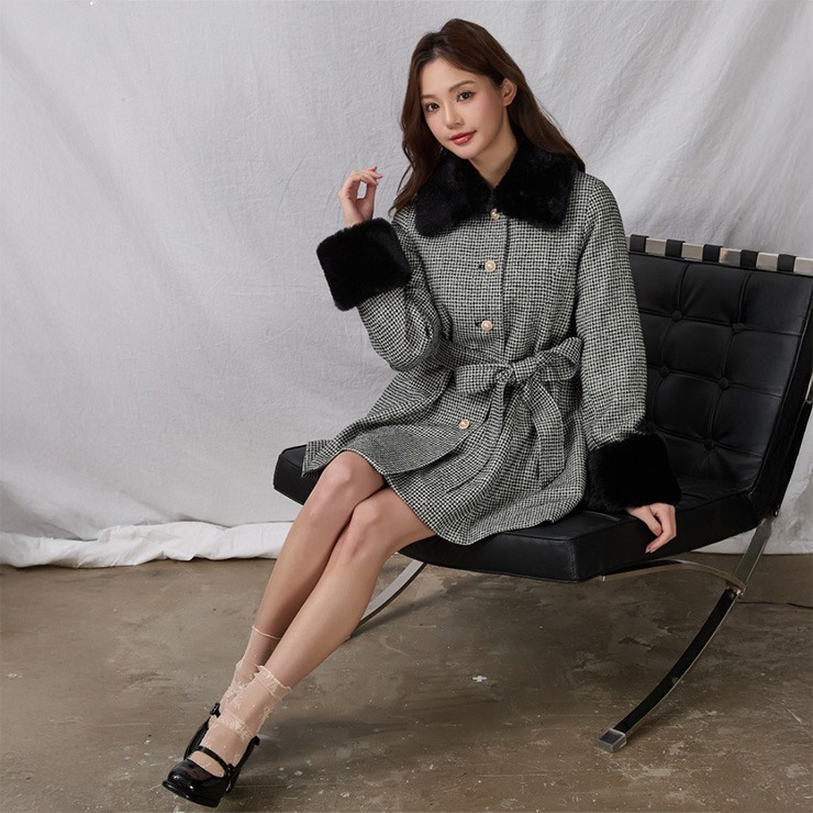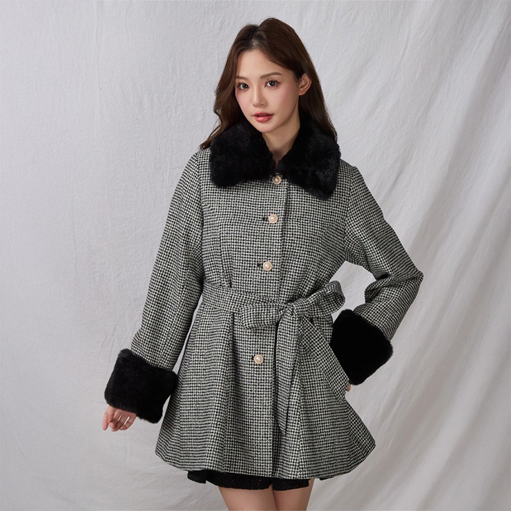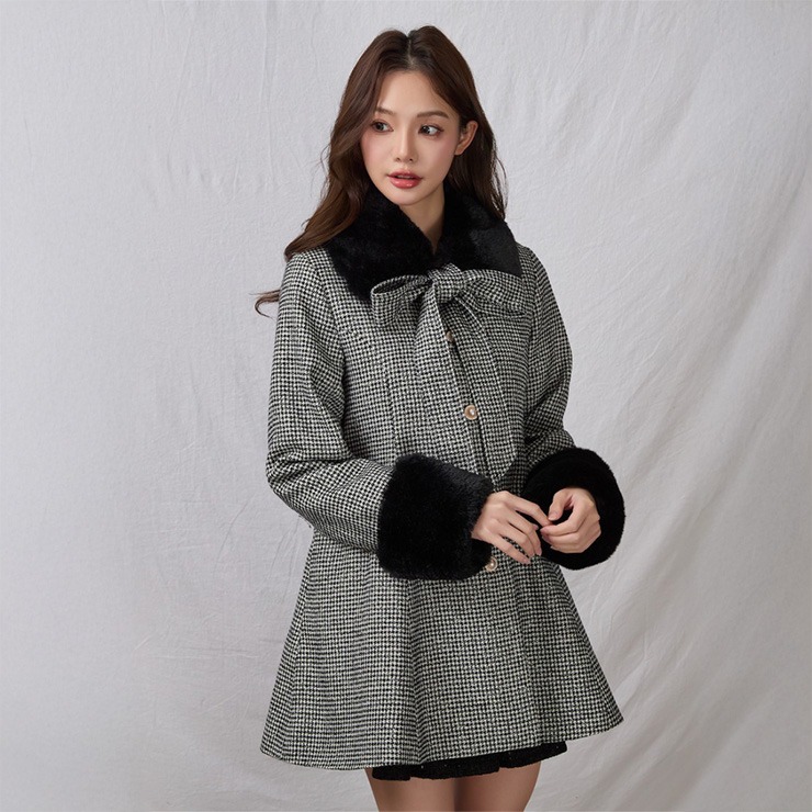 大きなリボンと襟と袖口にあしらったふわふわのファーが目を惹く、女性らしいシルエットを演出してくれるミドル丈コート。