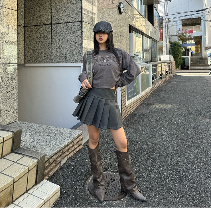 ビンテージ加工が施されたフェイクレザープリーツスカートです。