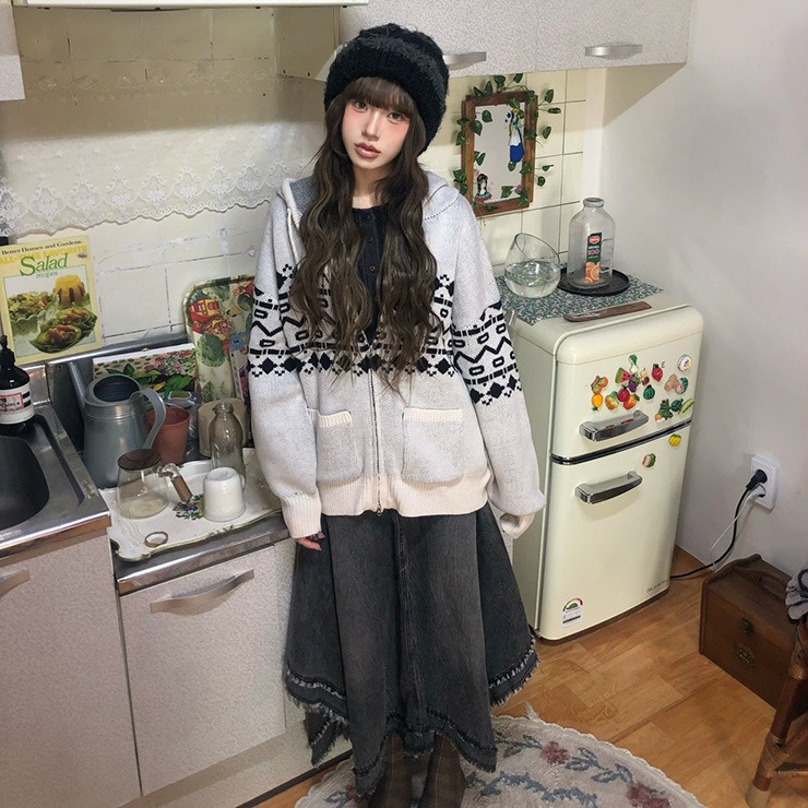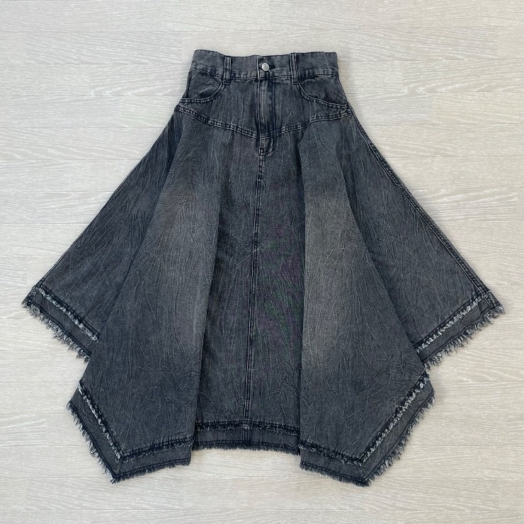 ビンテージ感のある色味や加工感と裾のフリンジがポイントのデニムイレヘムスカートです。
