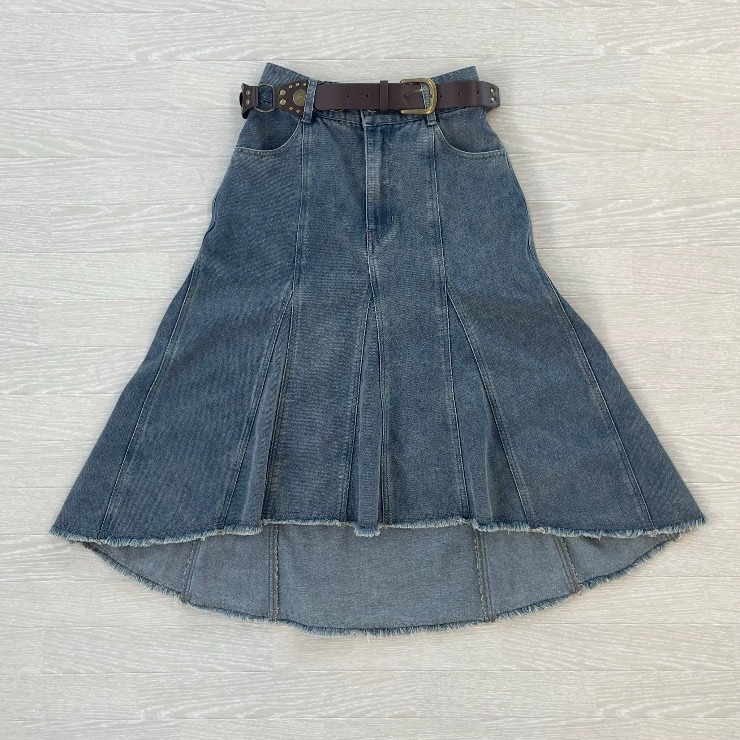 重量感とビンテージ感のあるベルトが付いたフリンジがポイントのデニムフレアスカートです。