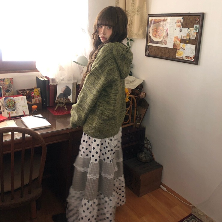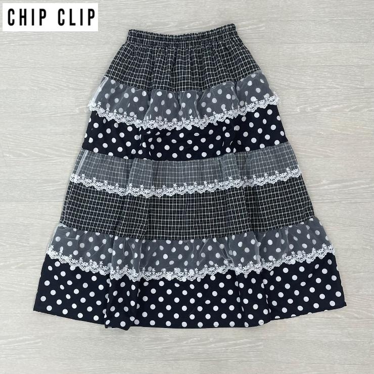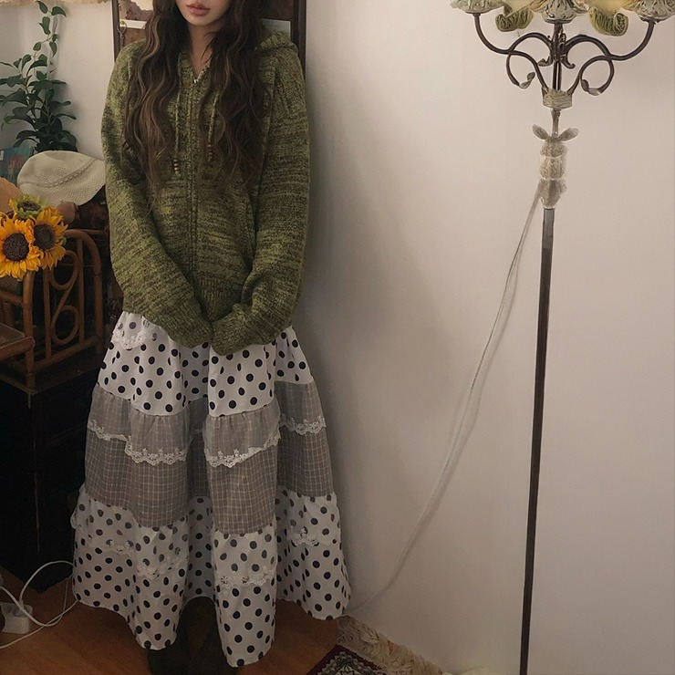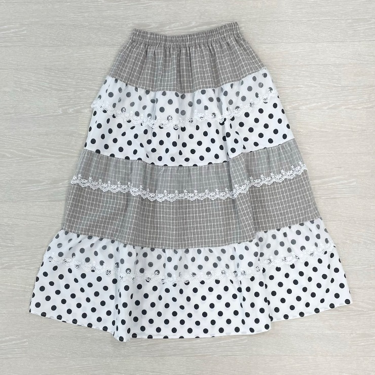 チェック×水玉の大胆な切り替えデザインが目を惹くデザインパッチワークスカートです。