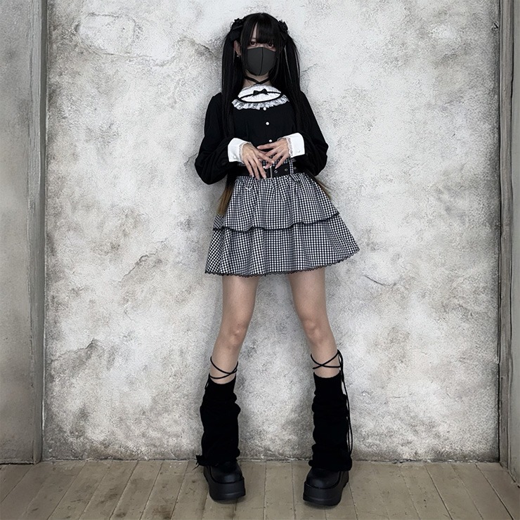 エッジの効いた合皮ベルトにふんわり広がったティアードスカートがダークかわいい印象に♪