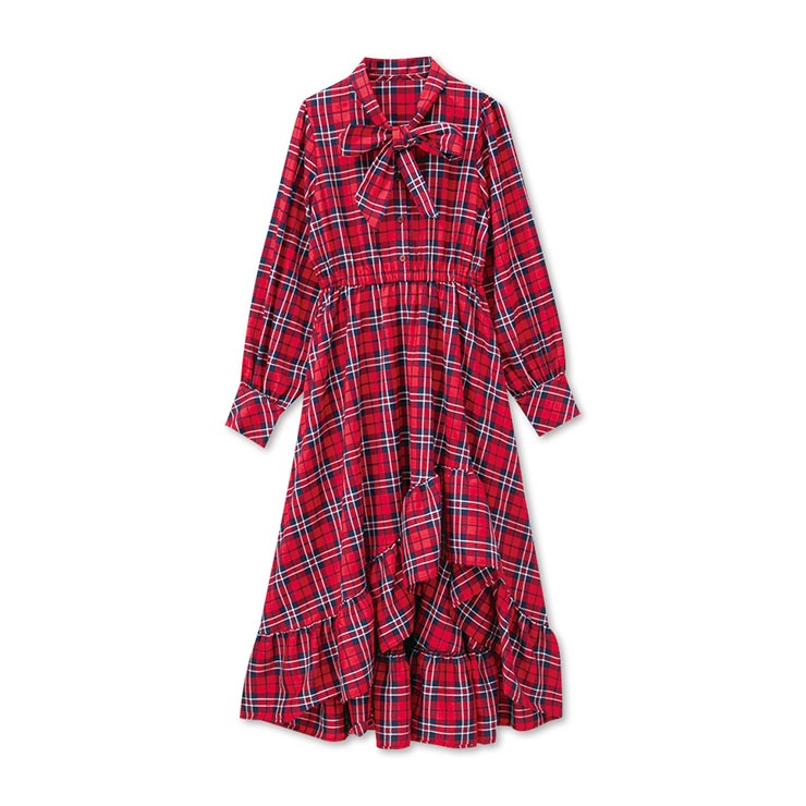 ロンドンを思わせる大胆なチェック柄が目を惹く、ボウタイワンピースです。