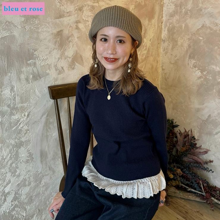 レディース フリル付リブニットプルオーバー(bleu et rose×remi)