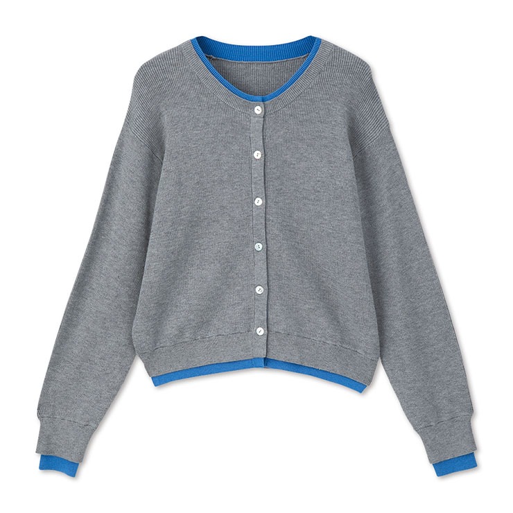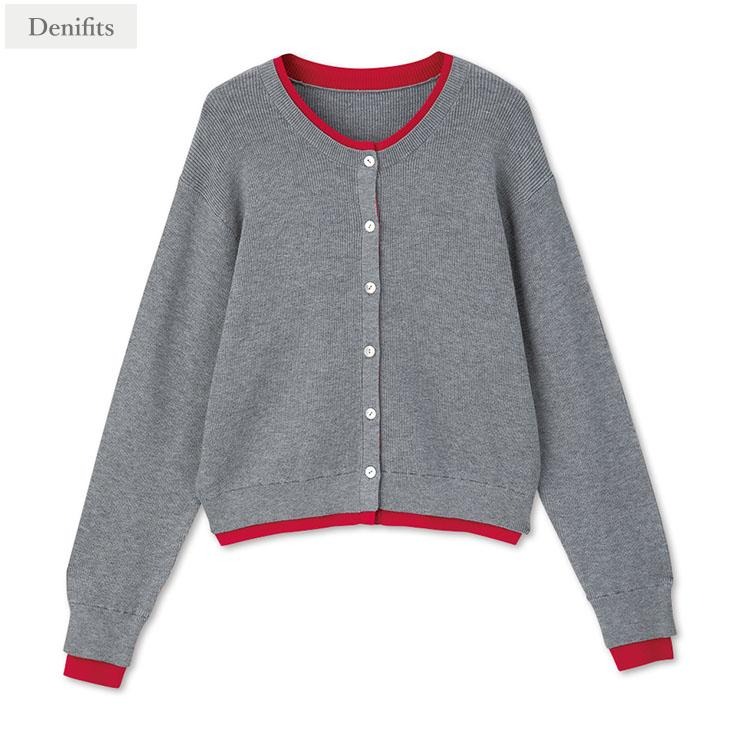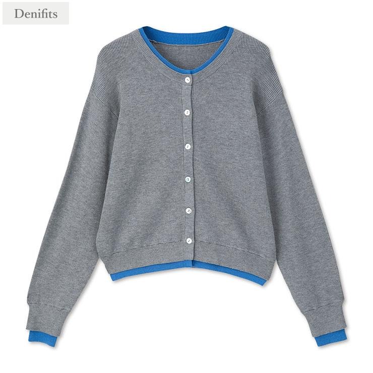 カーディガンを2枚重ね着したようなデザインが特徴のニットカーディガン。